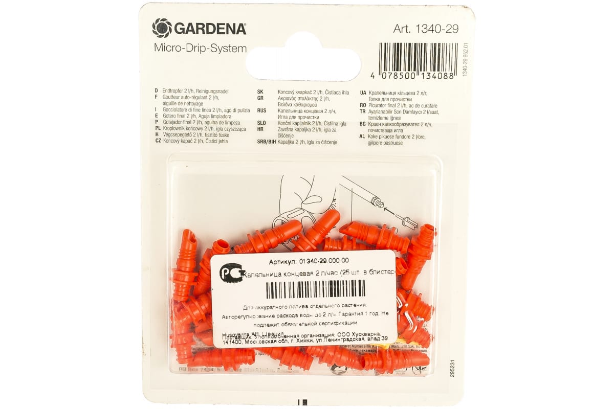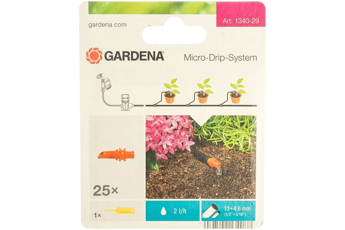 Капельница концевая Gardena 01340-29.000.00 входит в состав системы микрокапельного полива. Предназначена для направленного полива растений со сходной потребностью во влаге. Для орошения одиночного растения капельницу подключают напрямую к шлангу диаметром 13 мм (диаметр подающего шланга - 3/16"). При засорении капельницы можно использовать иглу для прочистки, идущую в комплекте.
