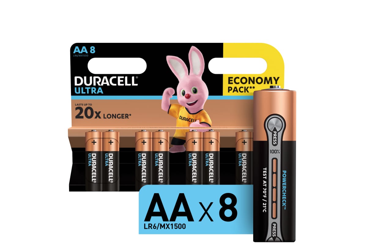 • Duracell Ultra — наша самая долговечная батарейка (самая долговечная батарейка Duracell типа ААА по результатам теста стандарта IEC ААА 2015. Результаты могут варьироваться в зависимости от устройства и интенсивности использования).