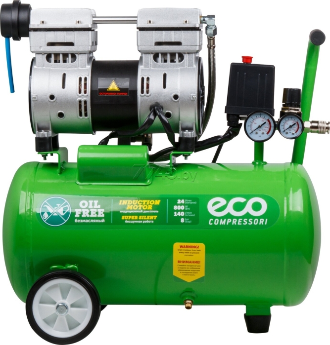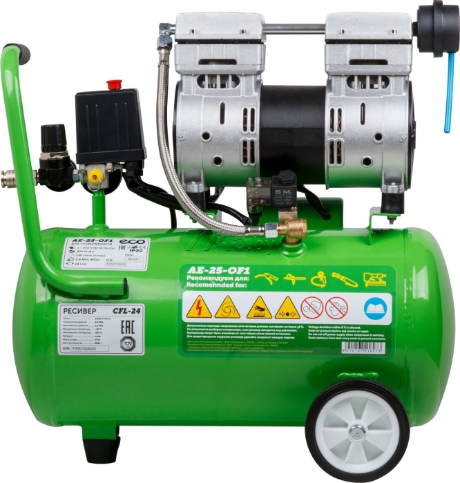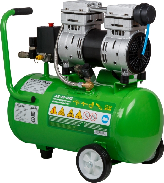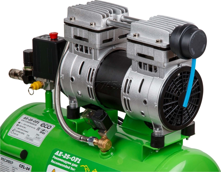 Компрессор безмасляный ECO AE-25-OF1 для использования не требуется заливка масла. Низкий уровень шума. 2-цилиндровый. Регулятор давления. Электромагнитный клапан. Манометры с металлическим корпусом. Дополнительная воздушная трубка для уменьшения уровня шума. Воздушный фильтр с бумажным фильтроэлементом.