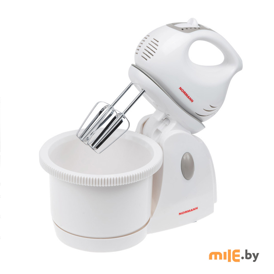 Миксер NORMANN AMX-513 предназначен для смешивания жидких и сыпучих продуктов, приготовления соусов и десертов (взбитых сливок, пудингов, коктейлей, майонеза) с помощью венчиков, входящих в комплект прибора, а также для замешивания теста различной консистенции тестомесильными крюками. Прибор может использоваться как стационарный, так и как ручной миксер. Максимальная мощность прибора 350 Вт. Прибор оснащен 3мя скоростями вращения и турборежимом.