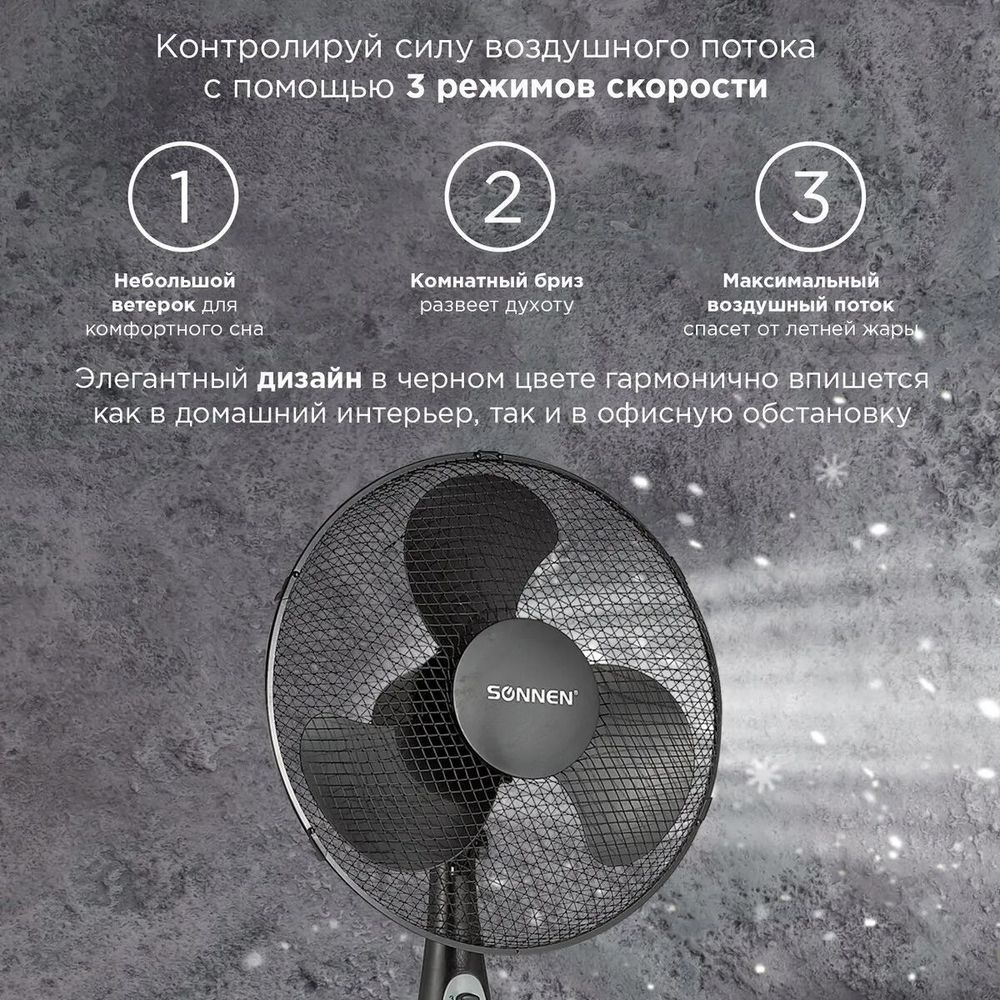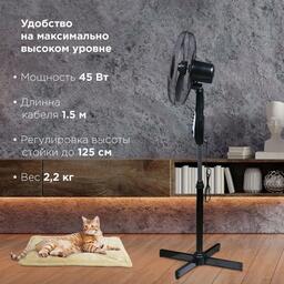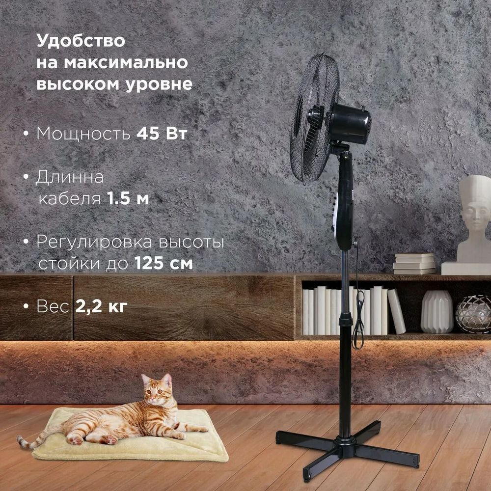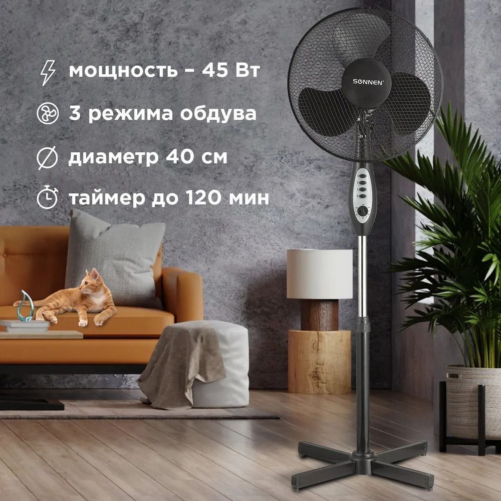 Напольный, осевой, мощность 45 Вт, лопасти 40 см, количество скоростей 3, управление механическое, вращающийся корпус, таймер.