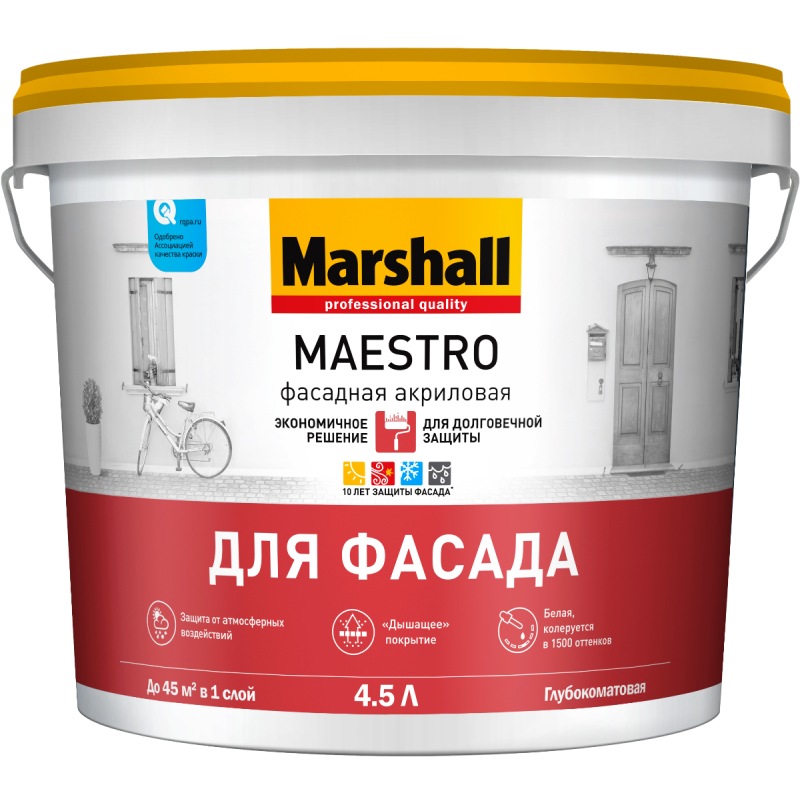Краска MARSHALL Maestro Фасадная - глубокоматовая акриловая краска для фасадных поверхностей*Защищает поверхность от снега, дождя и солнца на 10 лет*Образует паропроницаемое покрытие*Без брызг и потековОПИСАНИЕГлубокоматовая водно-дисперсионная акриловая краска для наружных работ. При нанесении образует гладкое высокоукрывистое, атмосферостойкое покрытие, с хорошими грязе- и водоотталкивающими свойствами. Глубокоматовая структура визуально делает поверхность более ровной, позволяя скрыть небольшие дефекты. Срок службы покрытия на фасадных поверхностях до 10 лет.ОБЛАСТЬ ПРИМЕНЕНИЯДля наружных работ. Подходит для нанесения на полностью просохшие гладкие минеральные поверхности (бетон, штукатурка, кирпич и т.д.) Для окрашивания фактурных покрытий , декоративных штукактурок наносите краску тонкими слоями. Рекомендуется для окраски фасадов жилых и общественных зданий, подземных гаражей, остекленных бавлконов, лоджий, тамбуров.ТЕХНИЧЕСКИЕ ДАННЫЕСвязующее: дисперсия стирол-акрилового сополимераРазбавитель: водаРабочие инструменты: кисть, валик, распылительСухой остаток ( масс): 53%Плотность: 1,42 кг/лВодопроницаемость:0,6 кг/ (м² *ч½), 1 классПаропроницаемость: 418.0 г/(м²*день), 1 классВремя до нанесения следующего слоя: 1 часВремя полного высыхания покрытия: 2-4 часаРасход на 1 слой: до 10 м²/лСистема колеровки: AcomixУход за окрашенной поверхностью: очистку покрытия при необходимости производить не ранее чем через месяц после покраски, промывкой водой под давлением без применения моющих средств.Срок и условия хранения: 2 года при t° от +5°С до +30°С в невскрытой заводской упаковке вдали от источников излучения, нагревательных и осветительных приборов.