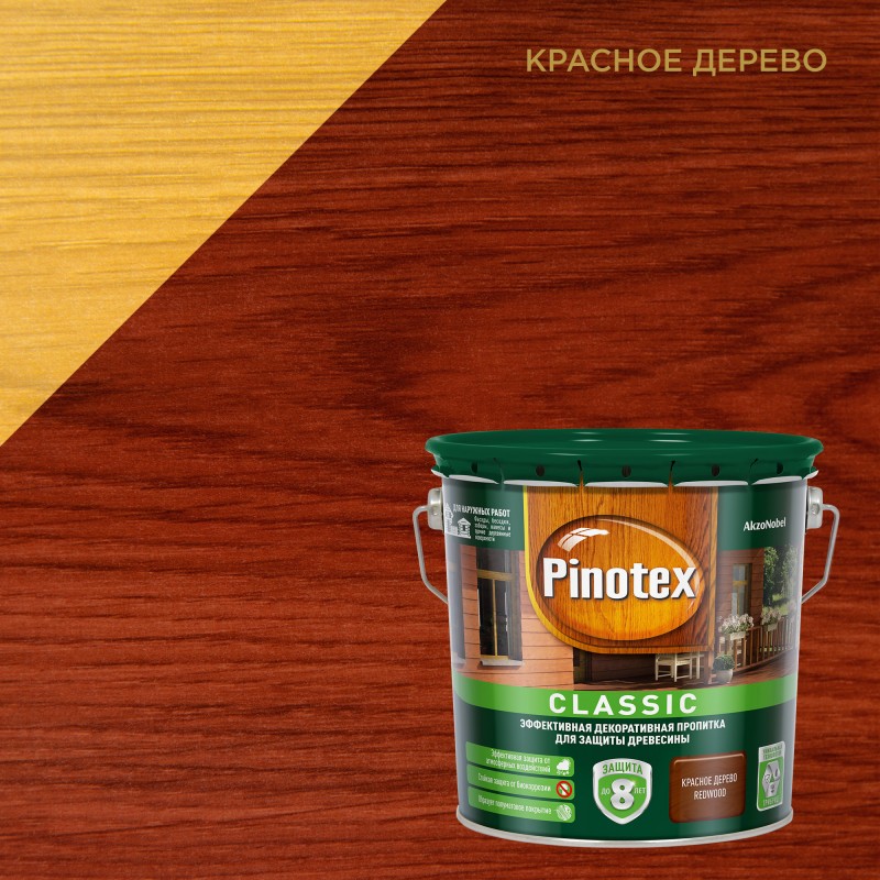 PINOTEX CLASSIC (ПИНОТЕКС КЛАССИК) - эффективная декоративная пропитка для защиты древесины до 8 лет.ОПИСАНИЕПолуматовая прозрачная декоративная пропитка на масляной основе эффективно защищает глубокие и внешние слои древесины до 8 лет за счет технологии ТРИБРИД1. АЛКИДНАЯ СМОЛА в составе создает прочное покрытие;2. ЛЬНЯНОЕ МАСЛО питает глубокие слои, уменьшая естественное растрескивание;3. ЧАСТЬ ОРГАНИЧЕСКОГО РАСТВОРИТЕЛЯ (уайт-спирит) заменена водой, поэтому пропитка имеет менее выраженный запах, сниженное содержание ЛОС (летучие органические соединения) и легче наносится в сравнении с продуктами на полностью органическом растворителе.Подчеркивает естественную текстуру древесины. Содержит активные добавки против плесени и синевы. Рекомендуется применять в системе с грунтовкой Pinotex Base для усиления защитных свойств.ОБЛАСТЬ ПРИМЕНЕНИЯДля наружных работ. Подходит для окраски поверхностей из пиленой и строганной древесины, например, стен фасадов, беседок, садовой мебели, заборов, окон, дверей, навесов и прочее. Не рекомендуется использовать в жилых помещениях. Допускается использование пропитки для бревенчатых строений и полукруглых облицовочных профилей. При окрашивании горизонтальных поверхностей рекомендуется применять с лаком Pinotex Lacker Yacht.УНИКАЛЬНЫЕ КОМПОНЕНТЫ: льняное масло, добавки против грибка и водорослейСВЯЗУЮЩЕЕ: алкидная смола, модифицированная алифатическими соединениямиРАСТВОРИТЕЛЬ: уайт-спиритВРЕМЯ ДО НАНЕСЕНИЯ СЛЕДУЮЩЕГО СЛОЯ: 12 часовВРЕМЯ ПОЛНОГО ВЫСЫХАНИЯ: 24 ЧАСАРАСХОД НА ОДИН СЛОЙ: строганная древесина до 16 м²/л; пиленая древесина до 9 м²/лГОТОВЫЕ ЦВЕТА: сосна, тик, красное дерево, орех, палисандр, светлый дуб, калужница, орегон, рябинаКОЛЕРОВКА: колеруется в 50 оттенков по вееру древесная гармонияРАБОЧИЕ ИНСТРУМЕНТЫ: кисть с натуральным или смешанным ворсом, распылительРАЗБАВЛЕНИЕРазбавление не требуется. При необходимости осветления выбранного оттенка разбавить в соотношении не более 1 части пропитки Classic бесцветной на 2 части оттеночной.ОСОБЕННОСТИ ПРИМЕНЕНИЯПеред применением и в процессе работы тщательно перемешивать. Произвести подготовку поверхности (отшлифуйте, затем уберите пыль неворсистой тканью). В случае, если на поверхности заметны гниль, смола или смоляные карманы, пятна ржави, дубильные вещества тщательно отшлифуйте поверхность, обработайте блокирующем грунтом или антисептиком. Рекомендуется наносить в два слоя при температуре не ниже +10 С° и не выше+25 С°, относительной влажности воздуха от 40% до 80%, влажности древесины <18%.Особо тщательно пропитывать торцевые поверхности обрабатываемой древесины.Каждый последующий наносимый слой делает цвет на поверхности более насыщенным и более устойчивым к воздействию UV лучей. Для создания эффекта натурального покрытия допустимо применять базу под колеровку как самостоятельное покрытие , но защитные свойства будут ниже, чем у цветного.ВНИМАНИЕ! При понижении температуры и увеличении относительной влажности воздуха время высыхания может увеличиться. Если поверхность находится под интенсивным воздействием солнечных лучей, рекомендуется наносить пропитку в 3 слоя. Эксплуатацию окрашенной поверхности начинайте не ранее, чем через 14 дней после окрашивания.