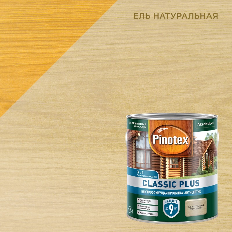 PINOTEX Classic Plus (ПИНОТЕКС классик плюс) - быстросохнущая пропитка-антисептик на гибридной основе для защиты древесины до 9 летБыстросохнущая пропитка-антисептик• До 9 лет защиты*• 3 в 1: грунт + защита + декор• Защита от влаги, плесени и УФ• Сохнет за 2 часа, окраска за один день• Идеальна для бревенОПИСАНИЕБыстросохнущая пропитка-антисептик на гибридной основе для защиты древесины до 9 лет.1.Формула 3 в1. Грунт: обеспечивает равномерное впитывание в древесину; пропитка-антисептик защищает от плесени +образует декоративное финишное покрытие.2.Гибридное акрил-алкидное связующее образует атмосферостойкое паропроницаемое покрытие, древесина продолжает «дышать».3.Эластичное тонкое покрытие идеально подходит для обработки бревенчатых фасадов и бань.4.Вода в качестве растворителя, поэтому пропитка-антисептик имеет нейтральный запах, легко наносится и быстро сохнет.5.Сохраняет видимой текстуру древесины, полуматовая.6.Чем более насыщенный цвет пропитки, тем более выражены защитные свойства.ОБЛАСТЬ ПРИМЕНЕНИЯДля наружных работ. Pinotex Classic Plus идеально подходит для полукруглых облицовочных профилей , деревянныхстроений из бруса, оцилиндрованного бревна, вагонки, блокхауса, планкена, а также окон, дверей и других вертикальныхповерхностей из строганой и пиленой древесины.Рекомендуется для отделки лиственных и хвойных пород древесины.УНИКАЛЬНЫЕ КОМПОНЕНТЫ: УФ-фильтр, УФ-абсорбер, воск, добавки против плесениГИБРИДНОЕ СВЯЗУЮЩЕЕ: сополимер акриловый, алкидная эмульсияРАСТВОРИТЕЛЬ: водаВРЕМЯ ДО НАНЕСЕНИЯ СЛЕДУЮЩЕГО СЛОЯ: 2 часаВРЕМЯ ПОЛНОГО ВЫСЫХАНИЯ: 4 ЧАСАРАСХОД НА ОДИН СЛОЙ: строганная древесина до 15 м²/л; пиленая древесина до 12 м²/лГОТОВЫЕ ЦВЕТА: лиственница, красное дерево,палисандр, ель натуральная, сосна, тиковое дерево, скандинавский серыйКОЛЕРОВКА: колеруется в 50 оттенков по вееру древесная гармонияРАБОЧИЕ ИНСТРУМЕНТЫ: кисть со смешанным ворсом, распылительРАЗБАВЛЕНИЕПо необходимостиОСОБЕННОСТИ ПРИМЕНЕНИЯПеред применением и в процессе работы тщательно перемешивать, не допуская образования пузырьков воздуха вбанке. Произвести подготовку поверхности (отшлифуйте, затем уберите пыль неворсистой тканью). В случае, если наповерхности заметны гниль, смола или смоляные карманы пятна ржави, дубильные вещества, тщательно отшлифуйтеповерхность и обработайте антисептическим грунтом Pinotex Base.Работы необходимо проводить при температуре воздуха не ниже +10 °C и не выше +30 °C с относительной влажностьювоздуха не более 80%, влажности древесины < 18%. Перед применением и в процессе использования перемешивайтепропитку, не допуская образования пузырьков воздуха в банке. Наносить в 2-3 слоя кистью со смешанным ворсом по направлению волокон древесины. Для усиления защиты глубоких слоёв древесины используйте систему покрытия Pinotex Base.ВНИМАНИЕ! При понижении температуры и увеличении относительной влажности воздуха время высыхания можетувеличиться. Если поверхность находится под интенсивным воздействием солнечных лучей, рекомендуется наносить пропитку в 3 слоя.Деформация древесины в процессе усадки или несоблюдение условий нанесения может привести к нарушению целостности покрытия,в этом случае проведите ремонтные работы по восстановлению покрытия.Эксплуатацию окрашенной поверхности начинайте не ранее чем через 14 дней после окрашивания.
