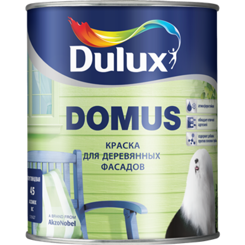 Краска по дереву для наружных работ Dulux DomusРазмер1 л 2,5 л 10 лОсновная информацияСтепень блеска - ПолуглянцевоеРасход - 13 м²/лВремя высыхания - 24 часа (1 слой), 48 часов (полное высыхание)Рекомендуемое количество слоев - 2Характеристики продуктаЭЛАСТИЧНОЕ ПОКРЫТИЕОТЛИЧНАЯ УКРЫВИСТОСТЬСВЕРХАДГЕЗИВНАЯУСТОЙЧИВАЯ К ВОЗДЕЙСТВИЮ АТМОСФЕРНЫХ ЯВЛЕНИЙСОДЕРЖИТ ДЕРЕВОЗАЩИТНЫЕ КОМПОНЕНТЫУЛУЧШЕННЫЕ ГРЯЗЕ- И ВОДООТТАЛКИВАЮЩИЕ СВОЙСТВАОписание продуктаПолуглянцевая масляно-алкидная краска для дерева для наружных работ. Образует эластичную, атмосферо- и светостойкую пленку, устойчивую к перепадам влажности и температуры. Придает древесине водо- и грязеотталкивающие свойства. Защищает древесину от плесени и водорослей. Обладает хорошей адгезией к поверхности и укрывистостью. Не имеет резкого запаха, легко наносится без потёков. Краска по дереву Dulux Domus подходит для окрашивания новых, а также ранее покрытых масляными и алкидными красками поверхностей из пиленой и строганой древесины. Рекомендуется для окрашивания стен деревянных фасадов, оконных рам, дверей, планок, флагштоков, беседок, заборов и др.Способ примененияПеред применением разбавить в рекомендованной пропорции и тщательно перемешать. Нанесение краски по дереву рекомендуется производить в два слоя при температуре воздуха и поверхности от +5 °C до +30 °C, относительной влажности воздуха от 40 до 80 %. Используйте кисть из натуральной щетины или валик для фасадных красок, содержащий органический растворитель.Подсказки и советы1. Подготовка поверхностейПоверхность должна быть чистой и сухой, влажностью менее 18%. Очистите поверхность от пыли, грязи, жира, отслаивающихся частей старого покрытия, плесени и грибка. Дефекты зашпатлюйте. Ранее окрашенные или зашпатлеванные поверхности обработайте шлифовальной бумагой и удалите шлифовальную пыль. Очищенную поверхность загрунтуйте грунтовкой для деревянных поверхностей DOMUS BASE.2. УборкаМаксимально очистите инструмент от остатков краски. Затем промойте инструмент растворителем Dulux SOLVE W.3. Хранение3 года при t° от +5°С до +30°С в невскрытой заводской упаковке вдали от источников излучения, нагревательных и осветительных приборов.Подпишитесь на наш
