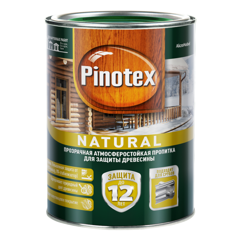 PINOTEX NATURAL (ПИНОТЕКС НАТУРАЛ) – прозрачная атмосферостойкая деревозащитная пропиткаОПИСАНИЕПрозрачная декоративно-защитная пропитка для сохранения натурального оттенка древесины. Связующее Pinotex Natural разработано на основе технологии AWB (AkzoNobel Wood protection Binder – это уникальный комплекс современных технологий создания и производства связующего нового типа, благодаря которому активные вещества проникают глубже и вымываются медленнее). Содержит активные добавки против плесени. Благодаря УФ - фильтру и УФ-стабилизатору окрашенная поверхность обладает усиленной стойкостью к воздействию прямых солнечных лучей. Пропитка легко наносится и быстро впитывается в поверхность древесины. Образует покрытие древесно-желтого оттенка, делая древесину более выразительной по текстуре и цвету. Рекомендуется применять в системе с грунтовкой Pinotex Base для дополнительной защиты глубоких слоев древесины. Технология AWB в финишных пропитках и грунтовка Pinotex Base вместе обеспечивают двойную активную защиту поверхности древесины.ОБЛАСТЬ ПРИМЕНЕНИЯДля наружных работ. Подходит для окраски поверхностей из пиленой и строганной древесины, например, стен фасадов, заборов, окон, дверей, навесов и т.п. Не рекомендуется использовать в жилых помещениях.УНИКАЛЬНЫЕ КОМПОНЕНТЫ: УФ-фильтр, УФ-стабилизатор, добавки против грибка и водорослейСВЯЗУЮЩЕЕ: алкидная смола модифицированная алифатическими соединениямиРАСТВОРИТЕЛЬ: уайт-спиритВРЕМЯ ДО НАНЕСЕНИЯ СЛЕДУЮЩЕГО СЛОЯ: 12 часовВРЕМЯ ПОЛНОГО ВЫСЫХАНИЯ: 24 часаРАСХОД НА ОДИН СЛОЙ: строганная древесина до 12 м²/л; пиленая древесина до 8 м²/лЦВЕТ: натуральный древесно-желтыйРАБОЧИЕ ИНСТРУМЕНТЫ: кисть со смешанным ворсом, распылительРАЗБАВЛЕНИЕРазбавление не требуетсяОСОБЕННОСТИ ПРИМЕНЕНИЯПеред применением и в процессе работы тщательно перемешивать. Произвести подготовку поверхности (отшлифуйте, затем уберите пыль неворсистой тканью). В случае, если на поверхности заметны гниль, смола или смоляные карманы, пятна ржави, дубильные вещества тщательно отшлифуйте поверхность, обработайте блокирующем грунтом или антисептиком. Рекомендуется наносить в 2-3 слоя при температуре не ниже +10 С° и не выше+25 С°, относительной влажности воздуха до 80%, влажности древесины <18%.Особо тщательно пропитывать торцевые поверхности обрабатываемой древесины. Продукт в банке имеет вид непрозрачной эмульсии. После высыхания продукта покрытие сохраняет естественный внешний вид древесины.ВНИМАНИЕ! При понижении температуры и увеличении относительной влажности воздуха время высыхания может увеличиться. Если поверхность находится под интенсивным воздействием солнечных лучей, рекомендуется наносить пропитку в 3 слоя. Эксплуатацию окрашенной поверхности начинайте не ранее, чем через 14 дней после окрашивания.