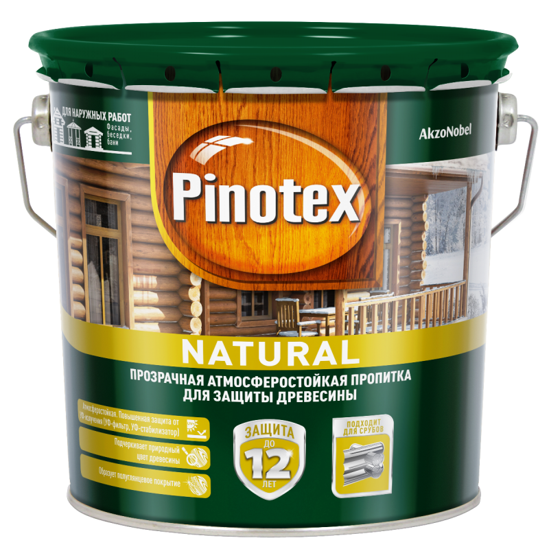PINOTEX NATURAL (ПИНОТЕКС НАТУРАЛ) – прозрачная атмосферостойкая деревозащитная пропиткаОПИСАНИЕПрозрачная декоративно-защитная пропитка для сохранения натурального оттенка древесины. Связующее Pinotex Natural разработано на основе технологии AWB (AkzoNobel Wood protection Binder – это уникальный комплекс современных технологий создания и производства связующего нового типа, благодаря которому активные вещества проникают глубже и вымываются медленнее). Содержит активные добавки против плесени. Благодаря УФ - фильтру и УФ-стабилизатору окрашенная поверхность обладает усиленной стойкостью к воздействию прямых солнечных лучей. Пропитка легко наносится и быстро впитывается в поверхность древесины. Образует покрытие древесно-желтого оттенка, делая древесину более выразительной по текстуре и цвету. Рекомендуется применять в системе с грунтовкой Pinotex Base для дополнительной защиты глубоких слоев древесины. Технология AWB в финишных пропитках и грунтовка Pinotex Base вместе обеспечивают двойную активную защиту поверхности древесины.ОБЛАСТЬ ПРИМЕНЕНИЯДля наружных работ. Подходит для окраски поверхностей из пиленой и строганной древесины, например, стен фасадов, заборов, окон, дверей, навесов и т.п. Не рекомендуется использовать в жилых помещениях.УНИКАЛЬНЫЕ КОМПОНЕНТЫ: УФ-фильтр, УФ-стабилизатор, добавки против грибка и водорослейСВЯЗУЮЩЕЕ: алкидная смола модифицированная алифатическими соединениямиРАСТВОРИТЕЛЬ: уайт-спиритВРЕМЯ ДО НАНЕСЕНИЯ СЛЕДУЮЩЕГО СЛОЯ: 12 часовВРЕМЯ ПОЛНОГО ВЫСЫХАНИЯ: 24 часаРАСХОД НА ОДИН СЛОЙ: строганная древесина до 12 м²/л; пиленая древесина до 8 м²/лЦВЕТ: натуральный древесно-желтыйРАБОЧИЕ ИНСТРУМЕНТЫ: кисть со смешанным ворсом, распылительРАЗБАВЛЕНИЕРазбавление не требуетсяОСОБЕННОСТИ ПРИМЕНЕНИЯПеред применением и в процессе работы тщательно перемешивать. Произвести подготовку поверхности (отшлифуйте, затем уберите пыль неворсистой тканью). В случае, если на поверхности заметны гниль, смола или смоляные карманы, пятна ржави, дубильные вещества тщательно отшлифуйте поверхность, обработайте блокирующем грунтом или антисептиком. Рекомендуется наносить в 2-3 слоя при температуре не ниже +10 С° и не выше+25 С°, относительной влажности воздуха до 80%, влажности древесины <18%.Особо тщательно пропитывать торцевые поверхности обрабатываемой древесины. Продукт в банке имеет вид непрозрачной эмульсии. После высыхания продукта покрытие сохраняет естественный внешний вид древесины.ВНИМАНИЕ! При понижении температуры и увеличении относительной влажности воздуха время высыхания может увеличиться. Если поверхность находится под интенсивным воздействием солнечных лучей, рекомендуется наносить пропитку в 3 слоя. Эксплуатацию окрашенной поверхности начинайте не ранее, чем через 14 дней после окрашивания.