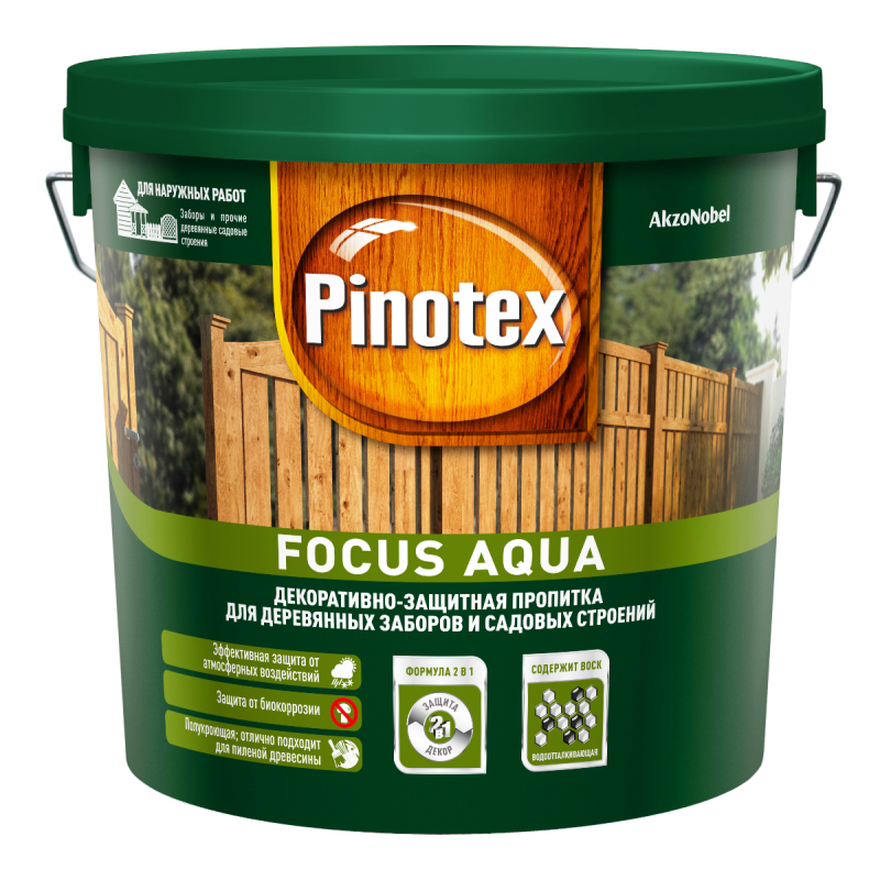 PINOTEX FOCUS AQUA (ПИНОТЕКС ФОКУС АКВА) – декоративно-защитная пропитка для деревянных заборов и садовых строенийОПИСАНИЕПолукроющая декоративно-защитная пропитка для заборов и садовых построек, изготовленных из пиленой древесины. Благодаря высокому содержанию атмосферостойких пигментов эффективно защищает деревянную поверхность от ультрафиолетового излучения. Применение воска в составе обеспечивает дополнительный водоотталкивающий эффект поверхности. Содержит эффективные антисептики для защиты древесины от плесени и водорослей. Подходит для разных пород древесины. Не стекает с инструмента и поверхности при нанесении.ОБЛАСТЬ ПРИМЕНЕНИЯДля наружных работ. Подходит для окраски конструкций из пиленой древесины, например заборов, ворот, калиток, небольших оград и садовых строений. Не рекомендуется использовать в жилых помещениях.УНИКАЛЬНЫЕ КОМПОНЕНТЫ: добавки против грибка и водорослей, воскСВЯЗУЮЩЕЕ: алкидная смолаРАСТВОРИТЕЛЬ: водаВРЕМЯ ДО НАНЕСЕНИЯ СЛЕДУЮЩЕГО СЛОЯ: 8 часовВРЕМЯ ПОЛНОГО ВЫСЫХАНИЯ: 12 ЧАСАРАСХОД НА ОДИН СЛОЙ: пиленая древесина 8-12 м²/лГОТОВЫЕ ЦВЕТА: рябина, красное дерево, палисандр, орех, золотая осень, зеленый лесРАБОЧИЕ ИНСТРУМЕНТЫ: кисть со смешанным ворсомРАЗБАВЛЕНИЕРазбавление не требуетсяОСОБЕННОСТИ ПРИМЕНЕНИЯПеред применением и в процессе работы тщательно перемешивать. Произвести подготовку поверхности (отшлифуйте, затем уберите пыль неворсистой тканью). В случае, если на поверхности заметны гниль, смола или смоляные карманы, пятна ржави, дубильные вещества тщательно отшлифуйте поверхность, обработайте блокирующем грунтом или антисептиком. Рекомендуется наносить в 2-3 слоя кистью со смешанным ворсом по направлению волокон древесины при температуре не ниже +10 С° и не выше+25 С°, относительной влажности воздуха до 80%, влажности древесины <18%.Особо тщательно пропитывать торцевые поверхности обрабатываемой древесины.ВНИМАНИЕ! При понижении температуры и увеличении относительной влажности воздуха время высыхания может увеличиться. Если поверхность находится под интенсивным воздействием солнечных лучей, рекомендуется наносить пропитку в 3 слоя. Эксплуатацию окрашенной поверхности начинайте не ранее, чем через 14 дней после окрашивания.