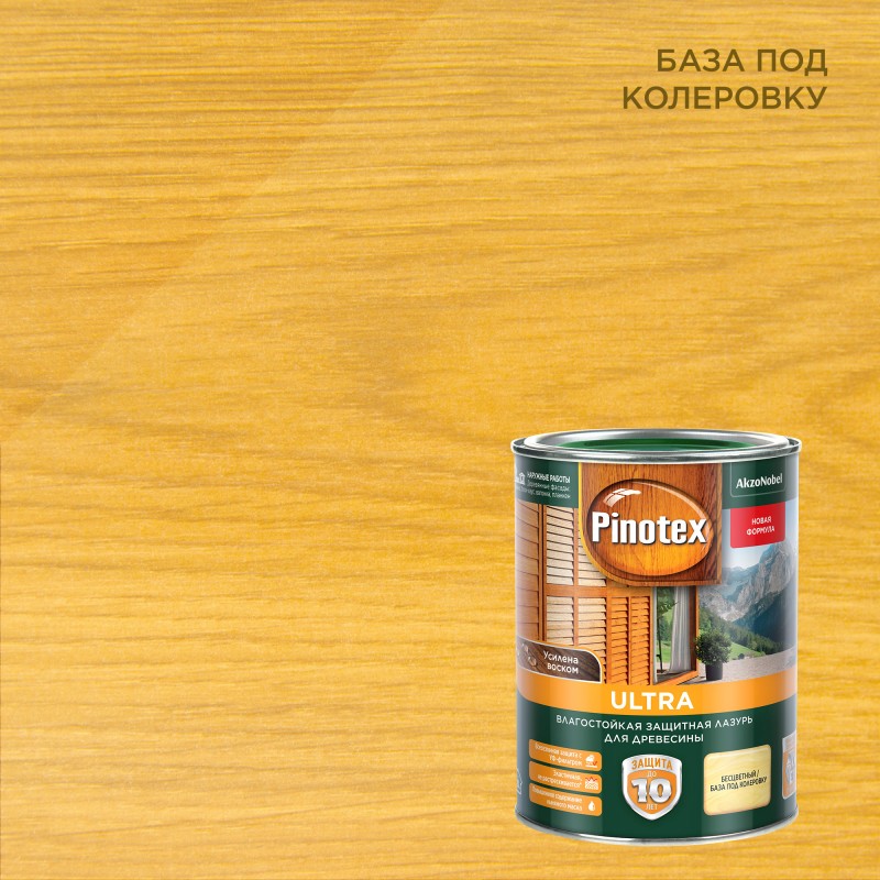 PINOTEX ULTRA (ПИНОТЕКС УЛЬТРА) – влагостойкая защитная, до 10 лет, лазурь для древесины ОПИСАНИЕВлагостойкая лазурь на масляной основе для комплексной защиты древесины от атмосферных явлений до 10 лет с технологией ТРИБРИД1. высокое содержание АЛКИДНЫХ СМОЛ нового поколения создает прочное и эластичное защитное покрытие, которое не растрескивается;2. ЛЬНЯНОЕ МАСЛО питает глубокие слои древесины, уменьшая естественное высыхание, а ВОСК-усиливает водоотталкивающие свойства покрытия;3. ЧАСТЬ ОРГАНИЧЕСКОГО РАСТВОРИТЕЛЯ заменена водой, поэтому лазурь имеет менее выраженный запах , сниженное содержание ЛОС (летучие органические соединения) и легче наносится, в отличии от продуктов на полностью органическом растворителе.Подчеркивает естественную текстуру древесины, полуглянцевая. С УФ-фильтром и добавками против плесени и синевы.ОБЛАСТЬ ПРИМЕНЕНИЯДля наружных работ. Подходит для деревянных строений из бруса, оцилиндрованного бревна, вагонки, блок хауса, планкена, а также окон, дверей, и других вертикальных поверхностей из строганной и пиленной древесины. Рекомендуется для отделки хвойных и лиственных пород древесины.УНИКАЛЬНЫЕ КОМПОНЕНТЫ: УФ-фильтр, воск, льняное масло, добавки против грибка и водорослейСВЯЗУЮЩЕЕ: алкидная смола, модифицированная алифатическими соединениямиРАСТВОРИТЕЛЬ: уайт-спиритВРЕМЯ ДО НАНЕСЕНИЯ СЛЕДУЮЩЕГО СЛОЯ: 12 часовВРЕМЯ ПОЛНОГО ВЫСЫХАНИЯ: 24 ЧАСАРАСХОД НА ОДИН СЛОЙ: твердая древесина до 20 м²/л; мягкая древесина до 15 м²/лГОТОВЫЕ ЦВЕТА: белый, сосна, орех, рябина, палисандр, красное дерево, калужница, орегон, тикКОЛЕРОВКА: колеруется в 50 оттенков по вееру древесная гармонияРАБОЧИЕ ИНСТРУМЕНТЫ: кисть с натуральным или смешанным ворсом, распылительРАЗБАВЛЕНИЕРазбавление не требуется. При необходимости осветления выбранного оттенка разбавить в соотношении не более 1 части лазури ULTRA бесцветной на 2 части оттеночной.ОСОБЕННОСТИ ПРИМЕНЕНИЯПеред применением и в процессе работы тщательно перемешивать. Произвести подготовку поверхности (отшлифуйте, затем уберите пыль неворсистой тканью). В случае, если на поверхности заметны гниль, смола или смоляные карманы, пятна ржави, дубильные вещества тщательно отшлифуйте поверхность, обработайте блокирующем грунтом или антисептиком. Рекомендуется наносить в два слоя при температуре не ниже +10 С° и не выше+30 С°, относительной влажности воздуха менее 80%, влажности древесины <18%.Особо тщательно пропитывать торцевые поверхности обрабатываемой древесины.Для создания эффекта натурального покрытия допустимо применять базу под колеровку как самостоятельное покрытие , но защитные свойства будут ниже, чем у цветного.ВНИМАНИЕ! При понижении температуры и увеличении относительной влажности воздуха время высыхания может увеличиться. Если поверхность находится под интенсивным воздействием солнечных лучей, рекомендуется наносить пропитку в 3 слоя. Эксплуатацию окрашенной поверхности начинайте не ранее, чем через 14 дней после окрашивания.