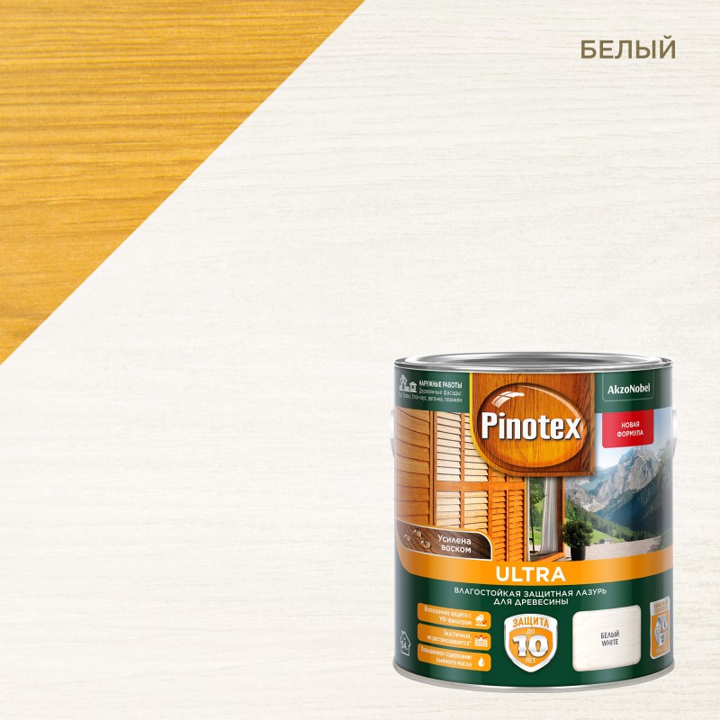 PINOTEX ULTRA (ПИНОТЕКС УЛЬТРА) – влагостойкая защитная, до 10 лет, лазурь для древесины ОПИСАНИЕВлагостойкая лазурь на масляной основе для комплексной защиты древесины от атмосферных явлений до 10 лет с технологией ТРИБРИД1. высокое содержание АЛКИДНЫХ СМОЛ нового поколения создает прочное и эластичное защитное покрытие, которое не растрескивается;2. ЛЬНЯНОЕ МАСЛО питает глубокие слои древесины, уменьшая естественное высыхание, а ВОСК-усиливает водоотталкивающие свойства покрытия;3. ЧАСТЬ ОРГАНИЧЕСКОГО РАСТВОРИТЕЛЯ заменена водой, поэтому лазурь имеет менее выраженный запах , сниженное содержание ЛОС (летучие органические соединения) и легче наносится, в отличии от продуктов на полностью органическом растворителе.Подчеркивает естественную текстуру древесины, полуглянцевая. С УФ-фильтром и добавками против плесени и синевы.ОБЛАСТЬ ПРИМЕНЕНИЯДля наружных работ. Подходит для деревянных строений из бруса, оцилиндрованного бревна, вагонки, блок хауса, планкена, а также окон, дверей, и других вертикальных поверхностей из строганной и пиленной древесины. Рекомендуется для отделки хвойных и лиственных пород древесины.УНИКАЛЬНЫЕ КОМПОНЕНТЫ: УФ-фильтр, воск, льняное масло, добавки против грибка и водорослейСВЯЗУЮЩЕЕ: алкидная смола, модифицированная алифатическими соединениямиРАСТВОРИТЕЛЬ: уайт-спиритВРЕМЯ ДО НАНЕСЕНИЯ СЛЕДУЮЩЕГО СЛОЯ: 12 часовВРЕМЯ ПОЛНОГО ВЫСЫХАНИЯ: 24 ЧАСАРАСХОД НА ОДИН СЛОЙ: твердая древесина до 20 м²/л; мягкая древесина до 15 м²/лГОТОВЫЕ ЦВЕТА: белый, сосна, орех, рябина, палисандр, красное дерево, калужница, орегон, тикКОЛЕРОВКА: колеруется в 50 оттенков по вееру древесная гармонияРАБОЧИЕ ИНСТРУМЕНТЫ: кисть с натуральным или смешанным ворсом, распылительРАЗБАВЛЕНИЕРазбавление не требуется. При необходимости осветления выбранного оттенка разбавить в соотношении не более 1 части лазури ULTRA бесцветной на 2 части оттеночной.ОСОБЕННОСТИ ПРИМЕНЕНИЯПеред применением и в процессе работы тщательно перемешивать. Произвести подготовку поверхности (отшлифуйте, затем уберите пыль неворсистой тканью). В случае, если на поверхности заметны гниль, смола или смоляные карманы, пятна ржави, дубильные вещества тщательно отшлифуйте поверхность, обработайте блокирующем грунтом или антисептиком. Рекомендуется наносить в два слоя при температуре не ниже +10 С° и не выше+30 С°, относительной влажности воздуха менее 80%, влажности древесины <18%.Особо тщательно пропитывать торцевые поверхности обрабатываемой древесины.Для создания эффекта натурального покрытия допустимо применять базу под колеровку как самостоятельное покрытие , но защитные свойства будут ниже, чем у цветного.ВНИМАНИЕ! При понижении температуры и увеличении относительной влажности воздуха время высыхания может увеличиться. Если поверхность находится под интенсивным воздействием солнечных лучей, рекомендуется наносить пропитку в 3 слоя. Эксплуатацию окрашенной поверхности начинайте не ранее, чем через 14 дней после окрашивания.
