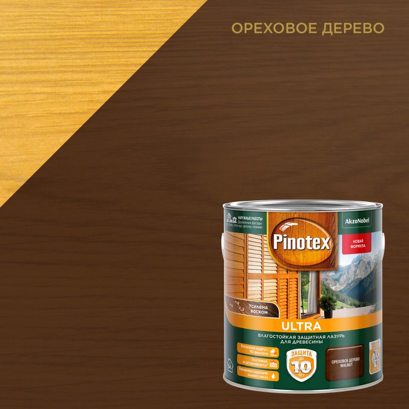 PINOTEX ULTRA (ПИНОТЕКС УЛЬТРА) – влагостойкая защитная, до 10 лет, лазурь для древесины ОПИСАНИЕВлагостойкая лазурь на масляной основе для комплексной защиты древесины от атмосферных явлений до 10 лет с технологией ТРИБРИД1. высокое содержание АЛКИДНЫХ СМОЛ нового поколения создает прочное и эластичное защитное покрытие, которое не растрескивается;2. ЛЬНЯНОЕ МАСЛО питает глубокие слои древесины, уменьшая естественное высыхание, а ВОСК-усиливает водоотталкивающие свойства покрытия;3. ЧАСТЬ ОРГАНИЧЕСКОГО РАСТВОРИТЕЛЯ заменена водой, поэтому лазурь имеет менее выраженный запах , сниженное содержание ЛОС (летучие органические соединения) и легче наносится, в отличии от продуктов на полностью органическом растворителе.Подчеркивает естественную текстуру древесины, полуглянцевая. С УФ-фильтром и добавками против плесени и синевы.ОБЛАСТЬ ПРИМЕНЕНИЯДля наружных работ. Подходит для деревянных строений из бруса, оцилиндрованного бревна, вагонки, блок хауса, планкена, а также окон, дверей, и других вертикальных поверхностей из строганной и пиленной древесины. Рекомендуется для отделки хвойных и лиственных пород древесины.УНИКАЛЬНЫЕ КОМПОНЕНТЫ: УФ-фильтр, воск, льняное масло, добавки против грибка и водорослейСВЯЗУЮЩЕЕ: алкидная смола, модифицированная алифатическими соединениямиРАСТВОРИТЕЛЬ: уайт-спиритВРЕМЯ ДО НАНЕСЕНИЯ СЛЕДУЮЩЕГО СЛОЯ: 12 часовВРЕМЯ ПОЛНОГО ВЫСЫХАНИЯ: 24 ЧАСАРАСХОД НА ОДИН СЛОЙ: твердая древесина до 20 м²/л; мягкая древесина до 15 м²/лГОТОВЫЕ ЦВЕТА: белый, сосна, орех, рябина, палисандр, красное дерево, калужница, орегон, тикКОЛЕРОВКА: колеруется в 50 оттенков по вееру древесная гармонияРАБОЧИЕ ИНСТРУМЕНТЫ: кисть с натуральным или смешанным ворсом, распылительРАЗБАВЛЕНИЕРазбавление не требуется. При необходимости осветления выбранного оттенка разбавить в соотношении не более 1 части лазури ULTRA бесцветной на 2 части оттеночной.ОСОБЕННОСТИ ПРИМЕНЕНИЯПеред применением и в процессе работы тщательно перемешивать. Произвести подготовку поверхности (отшлифуйте, затем уберите пыль неворсистой тканью). В случае, если на поверхности заметны гниль, смола или смоляные карманы, пятна ржави, дубильные вещества тщательно отшлифуйте поверхность, обработайте блокирующем грунтом или антисептиком. Рекомендуется наносить в два слоя при температуре не ниже +10 С° и не выше+30 С°, относительной влажности воздуха менее 80%, влажности древесины <18%.Особо тщательно пропитывать торцевые поверхности обрабатываемой древесины.Для создания эффекта натурального покрытия допустимо применять базу под колеровку как самостоятельное покрытие , но защитные свойства будут ниже, чем у цветного.ВНИМАНИЕ! При понижении температуры и увеличении относительной влажности воздуха время высыхания может увеличиться. Если поверхность находится под интенсивным воздействием солнечных лучей, рекомендуется наносить пропитку в 3 слоя. Эксплуатацию окрашенной поверхности начинайте не ранее, чем через 14 дней после окрашивания.