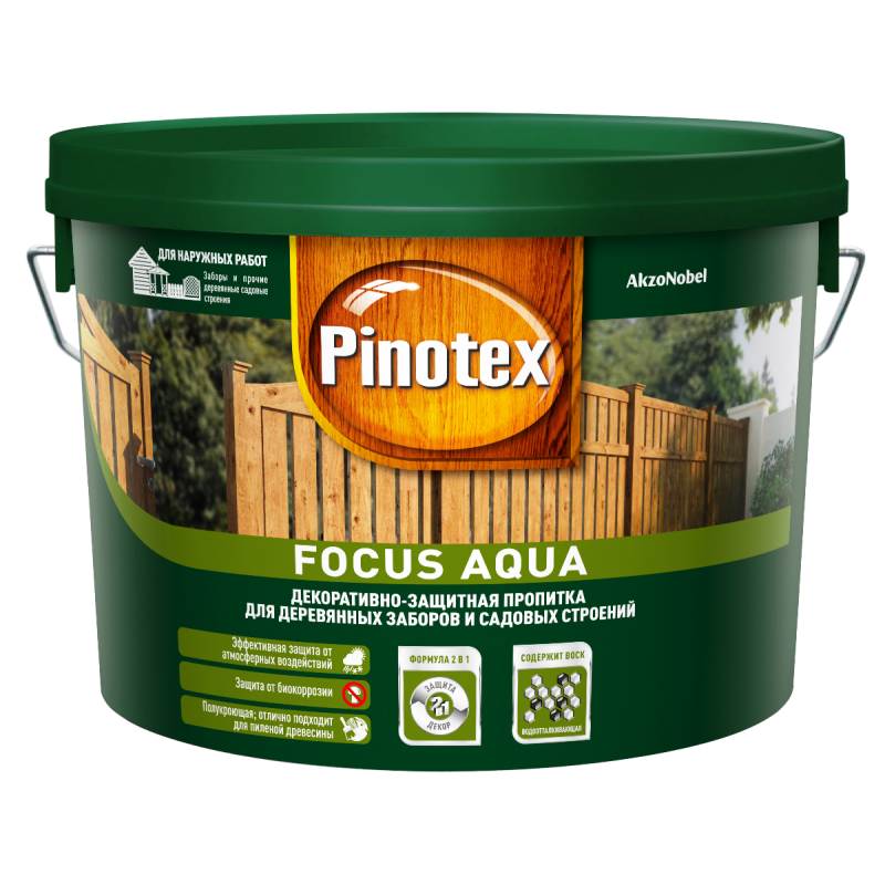 PINOTEX FOCUS AQUA (ПИНОТЕКС ФОКУС АКВА) – декоративно-защитная пропитка для деревянных заборов и садовых строенийОПИСАНИЕПолукроющая декоративно-защитная пропитка для заборов и садовых построек, изготовленных из пиленой древесины. Благодаря высокому содержанию атмосферостойких пигментов эффективно защищает деревянную поверхность от ультрафиолетового излучения. Применение воска в составе обеспечивает дополнительный водоотталкивающий эффект поверхности. Содержит эффективные антисептики для защиты древесины от плесени и водорослей. Подходит для разных пород древесины. Не стекает с инструмента и поверхности при нанесении.ОБЛАСТЬ ПРИМЕНЕНИЯДля наружных работ. Подходит для окраски конструкций из пиленой древесины, например заборов, ворот, калиток, небольших оград и садовых строений. Не рекомендуется использовать в жилых помещениях.УНИКАЛЬНЫЕ КОМПОНЕНТЫ: добавки против грибка и водорослей, воскСВЯЗУЮЩЕЕ: алкидная смолаРАСТВОРИТЕЛЬ: водаВРЕМЯ ДО НАНЕСЕНИЯ СЛЕДУЮЩЕГО СЛОЯ: 8 часовВРЕМЯ ПОЛНОГО ВЫСЫХАНИЯ: 12 ЧАСАРАСХОД НА ОДИН СЛОЙ: пиленая древесина 8-12 м²/лГОТОВЫЕ ЦВЕТА: рябина, красное дерево, палисандр, орех, золотая осень, зеленый лесРАБОЧИЕ ИНСТРУМЕНТЫ: кисть со смешанным ворсомРАЗБАВЛЕНИЕРазбавление не требуетсяОСОБЕННОСТИ ПРИМЕНЕНИЯПеред применением и в процессе работы тщательно перемешивать. Произвести подготовку поверхности (отшлифуйте, затем уберите пыль неворсистой тканью). В случае, если на поверхности заметны гниль, смола или смоляные карманы, пятна ржави, дубильные вещества тщательно отшлифуйте поверхность, обработайте блокирующем грунтом или антисептиком. Рекомендуется наносить в 2-3 слоя кистью со смешанным ворсом по направлению волокон древесины при температуре не ниже +10 С° и не выше+25 С°, относительной влажности воздуха до 80%, влажности древесины <18%.Особо тщательно пропитывать торцевые поверхности обрабатываемой древесины.ВНИМАНИЕ! При понижении температуры и увеличении относительной влажности воздуха время высыхания может увеличиться. Если поверхность находится под интенсивным воздействием солнечных лучей, рекомендуется наносить пропитку в 3 слоя. Эксплуатацию окрашенной поверхности начинайте не ранее, чем через 14 дней после окрашивания.