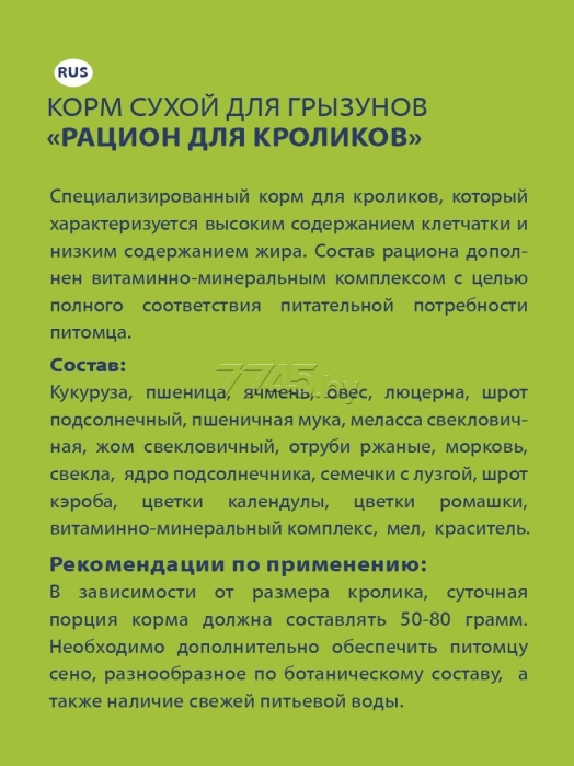 Рекомендации по кормлению: в зависимости от размера кролика, суточная порция корма должна составлять 50-80 грамм. Необходимо дополнительно обеспечить питомцу сено, разнообразное по ботаническому составу, а также наличие свежей питьевой воды.