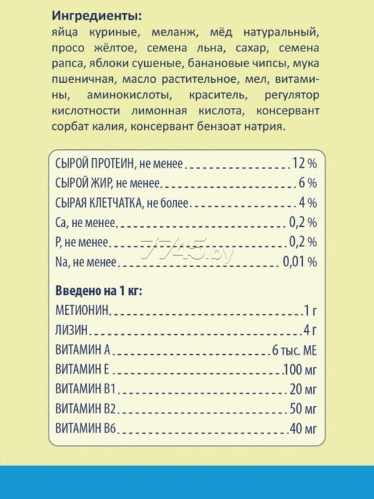 Рекомендации по кормлению: в зависимости от размера птицы дополнительный корм может составлять 1/3 часть от суточной порции основного рациона. Корм следует насыпать в пустые, сухие и чистые кормушки. Применяйте два-три раза в неделю. Во время периода линьки используйте корм ежедневно. Желательно начать применение рациона за две недели до начала линьки и продолжать кормление до полной смены оперения. Птицам, участвующим в разведении, начинайте давать корм ежедневно за 2-3 недели до кладки первого яйца. Кормление следует продолжать до завершения выкармливания птенцов. Необходимо проводить замену корма и воды ежедневно.