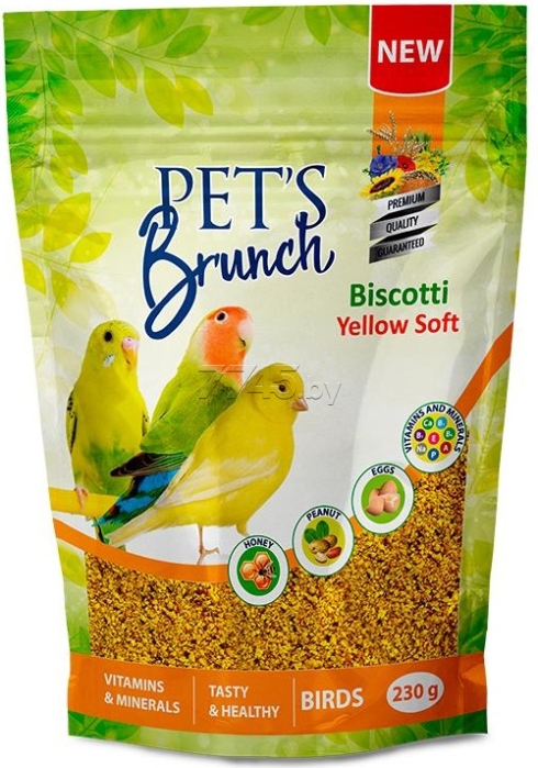 Корм для птиц PETS BRUNCH Biscotti Yellow Soft 0,23 кг (4812743000232) ‒ это специально разработанная функциональная добавка к основному рациону питания в период активного роста, линьки, сезона размножения, а также для укрепления здоровья ослабленных птиц с желтым оперением. Бисквитная крошка для всех видов декоративных птиц, на основе яиц и натурального мёда является дополнительным источником витаминов, минералов, а также комплекса незаменимых аминокислот.