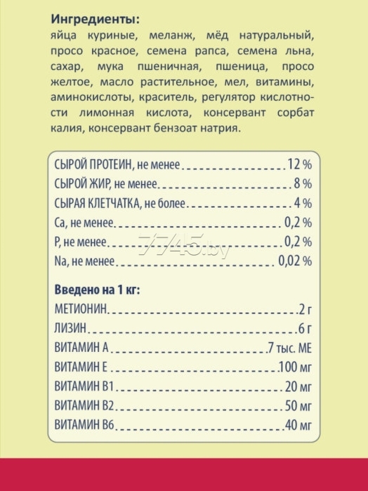 Корм для птиц PETS BRUNCH Biscotti Red Soft 0,23 кг + 0,23 кг (4812743000256OZ2) ‒ это специально разработанная функциональная смесь в виде бисквитной крошки, предназначенная для дополнительного питания птиц с преобладающим оперением красного окраса. Применение данного корма в периоды роста, линьки и размножения обеспечивает организм птицы необходимыми витаминами, минералами и незаменимыми аминокислотами, а также придает оперению более яркий и насыщенный цвет.