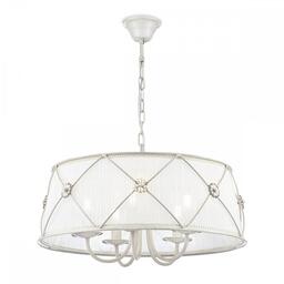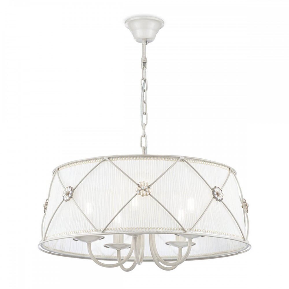 Светлая и по-настоящему домашняя серия светильников погружает освещаемый интерьер в дружественную теплую атмосферу. Золотистая тесьма и декоративные цветы довершают этот образ. Арматура выкрашена в жемчужный белый цвет. Абажуры, заключенные в металлический каркас, являются отличительной чертой светильников серии. Высоту люстр и подвесных светильников возможно регулировать по высоте, изменяя длину цепи.