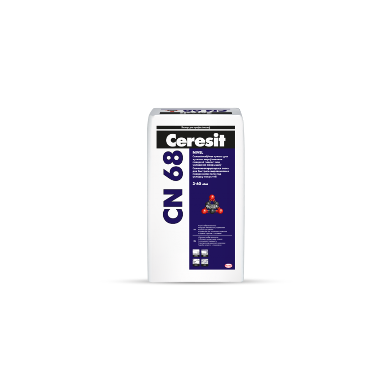 Ceresit CN 68. Самонивелирующаяся смесь на комбинированном вяжущем.Для быстрого выравнивания поверхности пола под укладку покрытий (толщина слоя от 3 до 60 мм).Область примененияСамонивелирующаяся смесь Ceresit CN 68 предназначена для выравнивания бетонных, цементно-песчаных и ангидритовых оснований пола с последующей укладкой таких покрытий, как линолеум, ковролин, ламинат, керамическая плитка, плита ПВХ и других полимерных покрытий в жилых, общественных, административных зданиях, а также в помещениях с малой интенсивностью воздействия жидкостей. Смесь не применяется в качестве финишного покрытия для пола.ТЕХНИЧЕСКИЕ ХАРАКТЕРИСТИКИОснова: цементно-гипсовая смесь с минеральными наполнителями и органическими добавкамиМаксимальная фракция зерна наполнителя:0,6 ммНасыпная плотность: около 1250 кг/м3Расход воды для приготовления смеси:5,0-5,5 л на 25 кг сухой смесиВремя потребления: около 30 минутГотовность к технологическому передвижению:-для толщины слоя до 5 мм через 4 часа; для толщины слоя до 10 мм через 8 часовВозможность укладки покрытий:-при слое от 3 до 5 мм;через 24 часа-при слое от 5 до 10 мм;через 72 часа-при слое от 10 до 30 мм;через 7 суток-при слое от 30 до 60 мм через 14 сутокТемпература применения: от +5 °С до +30 °СПрочность сцепления с основанием:≥0,5 МПаПрочность на сжатие через 28 суток:≥15 МПаПрочность на изгиб через 28 суток: ≥4 МПаОриентировочный расход: 1,8 кг/м2 на 1 мм толщины слояСрок хранения 12 месяцев с даты изготовления, указанной на упаковке.