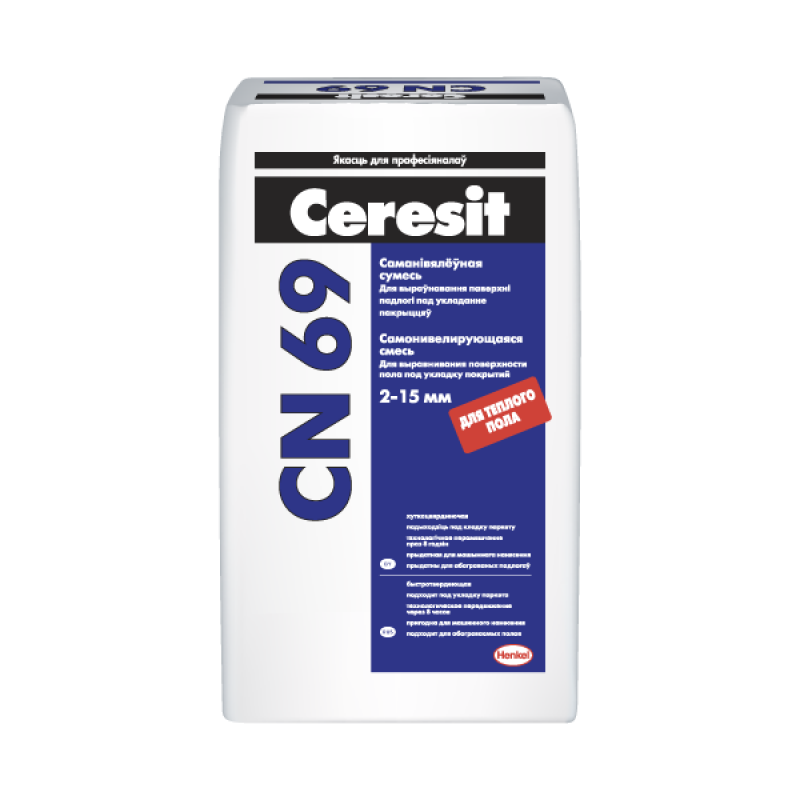 Ceresit CN 69 армированная микроволокнами самонивелирующаяся смесь повышенной прочности.Толщина слоя от 2 до 15 мм.Область применения:Армированная микроволокнами самонивелирующаяся смесь повышенной прочности Ceresit CN 69 предназначена для выравнивания бетонных оснований и стяжек пола из цементно-песчаных растворов, легкого бетона с последующей укладкой покрытий, таких как линолеум, ковролин, ламинат, паркет, паркетная доска, пробковые покрытия, керамическая плитка, плитка ПВХ и других полимерных покрытий в жилых, общественных, административных и бытовых помещениях. Подходит для выравнивания полов во влажных помещениях, за исключением поверхностей, подверженных постоянному воздействию воды (напр., бассейны). Во влажных помещениях следует нанести на самонивелирующуюся смесь гидроизоляцию Ceresit. Подходит для выравнивания обогреваемых стяжек, а также для подготовки основания под устройство обогреваемого пола.ТЕХНИЧЕСКИЕ ХАРАКТЕРИСТИКИОснова: смесь цементов с минеральными наполнителями и органическими добавкамиМаксимальная фракция зерна наполнителя: 0,6 ммНасыпная плотность: около 1100 кг/м3Расход воды для приготовления смеси: 4,25 л – 4,5 л на 25 кг сухой смесиВремя потребления: около 30 минутТемпература основания при применении: от +5 до +30 °СВозможность технологического передвижения: через 8 часовУстройство покрытий из керамической плитки: через 48 часовУстройство покрытий с использованием клеев на водной основе: через 72 часаУстройство покрытий с использованием клеев на органических растворителях: через 7 сутокПрочность сцепления с основанием: 1,0 МПаПрочность на сжатие через 28 суток: ≥20 МПаПрочность на изгиб через 28 суток: ≥ 4,0 МПаОриентировочный расход: 1,8 кг/м2 на 1 мм толщины слояСрок хранения 12 месяцев с даты изготовления, указанной на упаковке.