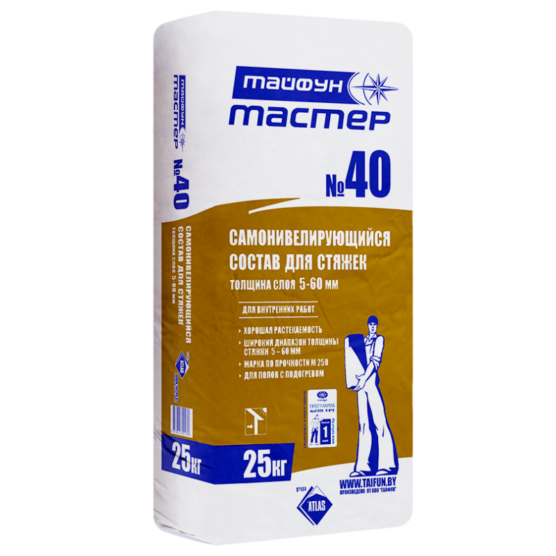ТАЙФУН МАСТЕР № 40ПОДГОТОВКА ПОВЕРХНОСТИ:Поверхность должна быть сухой, прочной и стабильной, очищенной от пыли, грязи, жировых, масляных пятен, краски, битума и других веществ и образований, препятствующих адгезии самонивелирующегося состава. Основания предварительно должны быть укреплены грунтовкой «Тайфун Мастер» №100 («Тайфун Мастер» №102). Стыки примыкания стен и пола необходимо проклеить защитной лентой.СПОСОБ ПРИГОТОВЛЕНИЯ:В предварительно подготовленную емкость налить холодную чистую воду и засыпать сухую смесь «Тайфун Мастер» №40 в пропорции: 25кг состава на 4,5-5,0 литра воды. Вымешивать состав до однородной массы мешалкой корзиночного типа (миксером). Приготовленный раствор обязательно выдержать в течение 5 минут. Перед нанесением повторно перемешать.НАНЕСЕНИЕ:Полученный раствор равномерно выливается на поверхность основания и распределяется при помощи ракли или шпателя, контролируя толщину слоя. Для удаления пузырьков воздуха и достижения однородности смеси, свежий раствор необходимо прокатывать специальным игольчатым валиком. Рекомендуемая толщина слоя от 10 до 60 мм. Уложенный раствор необходимо предохранять от повреждений, намокания, замерзания и пересушивания, нагрева свыше 25°С , а также интенсивного сквозного проветривания.РАСХОД: ориентировочный расход сухой смеси на 1 мм толщины слоя - 1,6- 1,8 кг/м2. Фактический расход зависит от характера поверхности и опыта рабочего.ТРЕБОВАНИЯ БЕЗОПАСНОСТИ:- к работам по приготовлению и применению состава не допускать лиц, имеющих заболевания кожных покровов, глаз и дыхательных путей;- в процессе работы обязательно применять средства индивидуальной защиты органов дыхания, кожных покровов и глаз.Состав: Смесь цемента, полимерного связующего, наполнителя и добавок.МАССА НЕТТО: 25 кгТехнические характеристики:Рабочая температура основания и окружающей среды от + 5ºС до + 25ºСЦвет серыйТолщина слоя 10 - 60 ммВремя использования готового состава прим. 30 минРастекаемость растворной смеси 22 - 25 смЛегкая эксплуатация поверхности 24 - 72 часаПолное нагружение не ранее 7 суток1. Применяемые для работы инструменты должны быть выполнены из некорродирующих материалов. 2. Для определения оптимальной консистенции необходимо 2 кг состава развести водой и вылить на ровное горизонтальное основание, покрытое полиэтиленовой пленкой. Диаметр расплыва правильно приготовленного раствора на поверхности пленки должен быть 50–65 см.3. Для получения качественного результата рекомендуется производить заливку составом непрерывно.4. Работать необходимо в защитных перчатках. При попадании состава в глаза следует немедленно промыть их чистой водой и обратиться к врачу.Срок хранения: 6 месяцев от даты изготовления