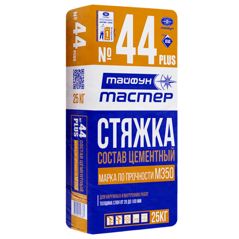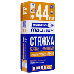 ОБЛАСТЬ ПРИМЕНЕНИЯ : Состав цементный для стяжек «Тайфун Мастер» №44 (44М) применяется для устройства горизонтальных бетонных полов толщиной одного слоя от 10 до 100 мм.