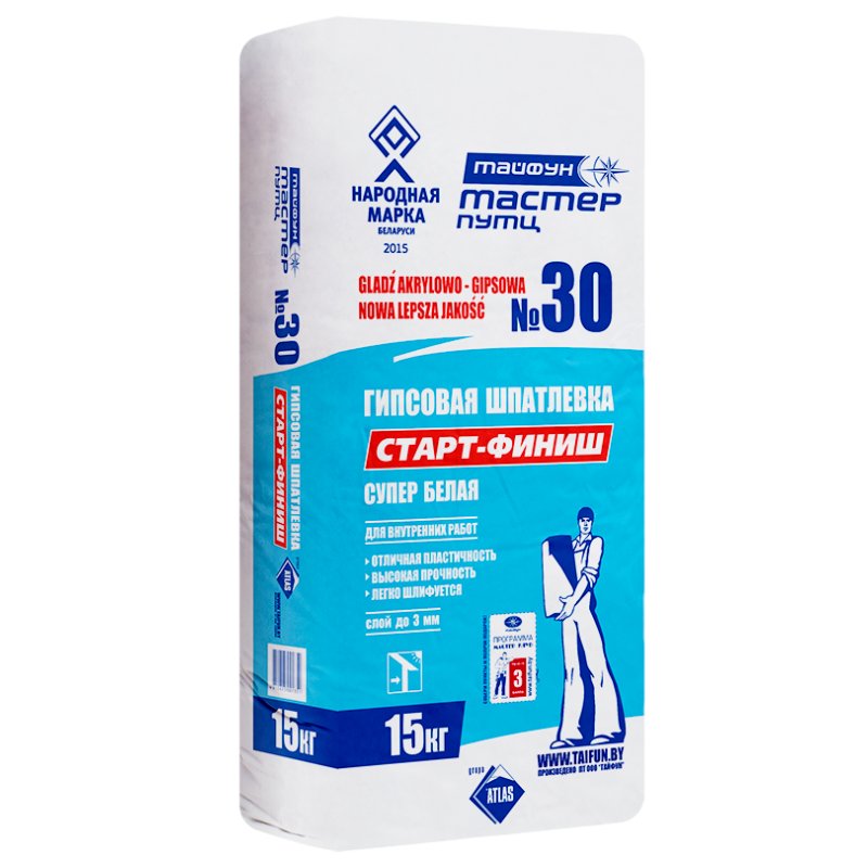 ТАЙФУН МАСТЕР №30Шпатлевка «Тайфун Мастер» №30 применяется для окончательного выравнивания поверхностей стен и потолков внутри помещений выполненных из гипсокартонныхи гипсоволокнистых плит, а также гипсовых, известково-цементных штукатурок и бетона. Может применяется для выравнивания неровностей и выбоин,сколов на поверхности и для заполнения стыков и швов гипсокартонных (ГКП)и гипсоволокнистых плит (ГВП).Подготовка поверхности:Поверхность должна быть очищенной от пыли, грязи, жировых, масляных пятен и других веществ и образований, препятствующих адгезии шпатлевочного состава. Поверхность рекомендуется укрепить грунтовкой «Тайфун Мастер» №100 («Тайфун Мастер» №102).Способ применения:В предварительно подготовленную емкость налить холодную чистую воду и засыпать сухую смесь «Тайфун Мастер» №30 в ориентировочной пропорции: 15кг состава на 6,5 - 7,5 литра воды. Применение каких-либо добавок не допускается. Вымешивать состав до однородной сметанообразной массы мешалкой корзиночного типа (миксером). По истечении 5 минут повторно перемешать. Полученный состав сохраняет свои свойства в течение 60 минут.Нанесение:Шпатлевка наносится на поверхность основания слоем толщиной 0,2-3,0 мм при помощи металлического шпателя и заглаживается. Для получения идеального результата поверхность шпатлевки после высыхания необходимо обработать мелкозернистой наждачной бумагой.Технические характеристики:Рабочая температура основания и окружающей среды от +5ºС до +25ºСЦвет белыйТолщина слоя 0,2 - 3,0 ммВремя использования готового состава прим. 60 минКоэффициент паропроницаемости не менее 0,03 мг/м·ч·ПаУсадка покрытия в слое рабочей толщины признаков усадки нетРасход: Ориентировочный расход сухой смеси 1,0-1,2 кг/м2 на 1 мм толщины слоя. Фактический расход зависит от характера поверхности и опыта рабочего.ТРЕБОВАНИЯ БЕЗОПАСНОСТИ:- к работам по приготовлению и применению состава не допускать лиц, имеющих заболевания кожных покровов, глаз и дыхательных путей;- в процессе работы обязательно применять средства индивидуальной защиты органов дыхания, покровов и глаз.Рабочая температура основания иСостав: Смесь гипса, полимерного связующего, наполнителя и добавок.МАССА НЕТТО: 5кг, 15 кг1. Применяемые для работы инструменты должны быть выполнены из некорродирующих материалов. 2. Тщательно очищайте емкость перед каждым новым замесом, так как это сильно влияет на характеристики состава.3. В качестве грунтовки ни в коем случае не допускается использовать обойный клей.4. Рекомендуемая толщина слоя 0,2-3,0 мм. В случае необходимости возможно заполнение трещин, швов, неровностей глубиной до 30 мм.5. Последующий слой шпатлевки наносите после высыхания предыдущего.6. До начала последующих отделочных работ должно пройти не менее 24 часов.7. Работать необходимо в защитных перчатках. При попадании состава в глаза следует немедленно промыть их чистой водой и обратиться к врачу.Срок хранения: 6 месяцев от даты изготовления