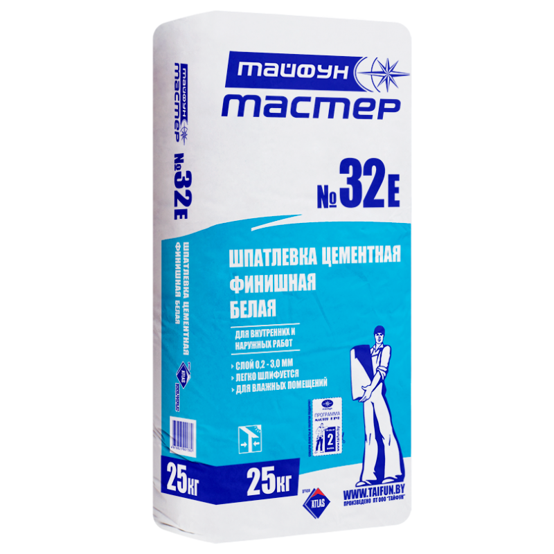ТАЙФУН МАСТЕР № 32С, №32ЕШпатлевка «Тайфун Мастер» №32е (32с) применяется для выполнения отделочных работ внутри и снаружи помещений с нормальным и повышенным влажностным режимом эксплуатации. Используется для окончательного выравнивания шероховатостей поверхностей, неровностей и трещин штукатурного слоя, заделки стыков и швов различных облицовочных материалов.Подготовка поверхности:Поверхность должна быть очищенной от пыли, грязи, жировых, масляных пятен, краски и других веществ и образований, препятствующих адгезии состава. Основания с повышенной гигроскопичностью необходимо укрепить грунтовкой «Тайфун Мастер» №100 («Тайфун Мастер» №102).Способ приготовления:В предварительно подготовленную емкость налить холодную чистую воду и засыпать сухую смесь «Тайфун Мастер» №32е (32с) в пропорции: 25 кг состава на 8–9 литров воды. Применение каких-либо добавок не допускается. Вымешивать состав до однородной сметанообразной массы мешалкой корзиночного типа (миксер). По истечении 5 минут повторно перемешать. Полученный состав сохраняет свои свойства в течение 2 часов.Нанесение:Шпатлевка наносится на поверхность основания слоем толщиной 0,5-3 мм при помощи металлического шпателя и заглаживается. При необходимости после высыхания производится окончательная обработка поверхности наждачной бумагой.Расход:Ориентировочный расход сухой смеси 1,5 кг/м2 на 1 мм толщины слоя. Фактический расход зависит от характера поверхности и опыта рабочего.Инструмент: Пластмассовая емкость, электродрель с мешалкой корзиночного типа (миксер), шпатель, терка.Транспортирование и хранение:Шпатлевка «Тайфун Мастер» №32е (32с) должна транспортироваться и храниться в заводской упаковке, в сухих условиях.ТРЕБОВАНИЯ БЕЗОПАСНОСТИ:- к работам по приготовлению и применению состава не допускать лиц, имеющих заболевания кожных покровов, глаз и дыхательных путей;- в процессе работы обязательно применять средства индивидуальной защиты органов дыхания, покровов и глаз.Состав:Смесь цемента, полимерного связующего, наполнителя и добавок.МАССА НЕТТО: 25 кгТехнические характеристики:Рабочая температура основания и окружающей среды от +5ºС до +25ºСЦвет №32е белыйТолщина слоя 0,5 - 3,0 ммВремя использования готового состава прим. 120 минКоэффициент паропроницаемости не менее 0,02 мг/м·ч·ПаВодопоглощение покрытия при капиллярном подсосе не более 2,0кг/м2Усадка покрытия в слое рабочей толщины признаков усадки нетМорозостойкость, марка не менее F751. Применяемые для работы инструменты должны быть выполнены из некорродирующих материалов. 2. Тщательно очищайте емкость перед каждым новым замесом, так как это сильно влияет на технологические характеристики состава.3. Рекомендуемая толщина слоя 0,5-3,0мм.4. Последующий слой шпатлевки наносите после высыхания предыдущего. 5. Работать необходимо в защитных перчатках. При попадании состава в глаза следует немедленно промыть их чистой водой и обратиться к врачу.Срок хранения: 12 месяцев от даты изготовления