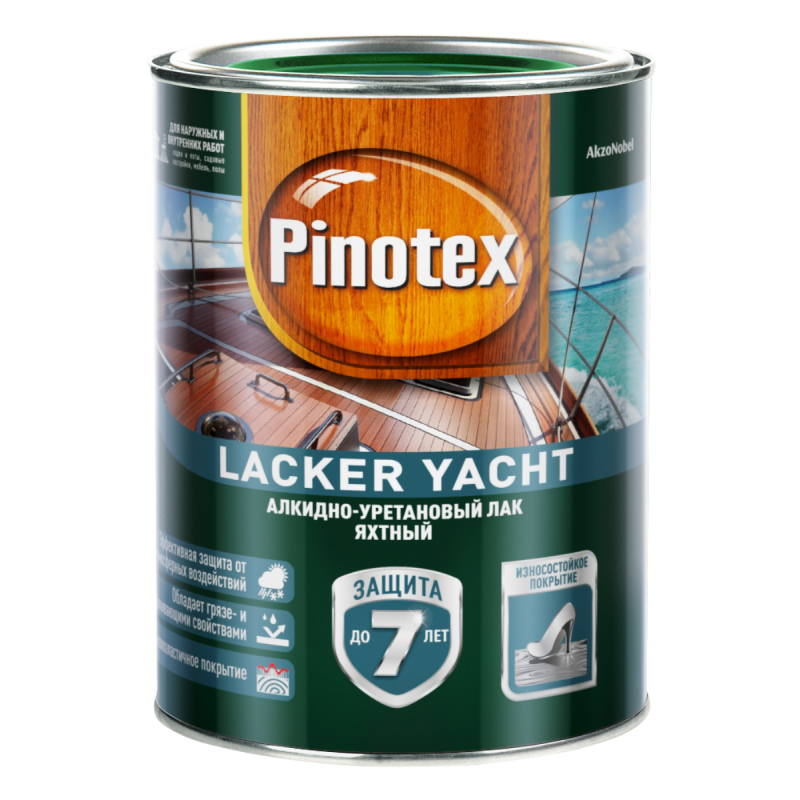 PINOTEX LACKER YACHT (ПИНОТЕКС ЛАК ЯХТНЫЙ) – яхтный алкидно-уретановый лак со сроком защиты до 7 летОПИСАНИЕАтмосферостойкий алкидно-уретановый лак для декоративно-защитной отделки деревянных поверхностей снаружи и внутри помещений. Образует высокоэластичное гладкое покрытие, устойчиво к перепадам влажности и температуры. При соблюдении технологии нанесения Pinotex Lacker Yacht обеспечивает срок защиты до 7 лет. Лакированная поверхность обладает грязе- и водоотталкивающими свойствами, легко очищается от бытовых загрязнений. Pinotex Lacker Yacht обладает твердостью паркетного лака, защищает деревянные поверхности от абразивного износа и механических повреждений (ударов, царапин и т.п.) Удобен в нанесении, легко разравнивается и не стекает с инструмента, не оставляет следов от кисти.ОБЛАСТЬ ПРИМЕНЕНИЯДля внутренних и наружных работ. Для лакирования стен, потолков, дверей, беседок, перил, садовой мебели, навесов и других деревянных поверхностей, а также деталей лодок и яхт выше ватерлинии. Возможно применение для лакировки деревянных и паркетных полов в условиях умеренной эксплуатационной нагрузки.СВЯЗУЮЩЕЕ: алкидно-уретановый сополимерРАСТВОРИТЕЛЬ: уайт-спиритВРЕМЯ ДО НАНЕСЕНИЯ СЛЕДУЮЩЕГО СЛОЯ: 4 часаВРЕМЯ ПОЛНОГО ВЫСЫХАНИЯ ПОКРЫТИЯ: 48 часовРАСХОД НА ОДИН СЛОЙ: до 15 м²/лЦВЕТ: бесцветныйРАБОЧИЕ ИНСТРУМЕНТЫ: кисть с натуральным или смешанным ворсом, аппликатор для нанесения лакаРАЗБАВЛЕНИЕДля первого (грунтовочного) слоя при необходимости добавьте не более 1 части уайт-спирита на 10 частей лака. Полуматовый лак разбавлять не нужно.ОСОБЕННОСТИ ПРИМЕНЕНИЯПеред нанесением осторожно перемешайте, не допуская образования пузырьков в банке. Произвести подготовку поверхности (отшлифуйте, затем уберите пыль неворсистой тканью). В случае, если на поверхности заметны гниль, смола или смоляные карманы, пятна ржави, дубильные вещества тщательно отшлифуйте поверхность, обработайте блокирующем грунтом или антисептиком. Рекомендуется наносить в 2-3 слоя по направлению волокон древесины. Работы рекомендуется проводить при температуре воздуха и поверхности от +5 С° и не выше+30 С° с относительной влажности воздуха от 40 до 80%, влажности древесины <18%.При наружных работах рекомендуется наносить 3 слоя Pinotex Lacker Yacht. Для защиты глубоких слоев древесины при наружных работах предварительно обработайте поверхность деревозащитной грунтовкой Pinotex Base.ВНИМАНИЕ! При понижении температуры и увеличении относительной влажности воздуха время высыхания может увеличиться. Эксплуатацию окрашенной поверхности начинайте не ранее, чем через 14 дней после окрашивания.