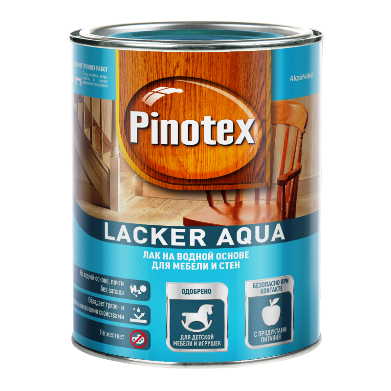 PINOTEX LACKER AQUA(ПИНОТЕКС ЛАК ВОДНЫЙ) – лак на водной основе для мебели и стенОПИСАНИЕКолеруемый прозрачный лак на водной основе. Не желтеет со временем, сохраняя естественную красоту древесины. Образует эластичное покрытие, устойчиво к ударам, царапинам, а также воздействию воды, грязи, жира, бытовой химии. Лакированная поверхность легко очищается от бытовых загрязнений. Лак удобен в использовании, легко разравнивается и не оставляет потеков, следов от инструмента при нанесении. Создает идеально гладкое финишное покрытие. Быстро высыхает, окрасочные работы можно завершить за один день. Ассортимент представлен разной степенью блеска для достижения желаемого эффекта: матовый - добавляет уюта и тепла в интерьере, не отвлекает внимание от мебели и элементов отделки, глянцевый - нарядный блеск визуально делает более выразительной структуру древесины.ОБЛАСТЬ ПРИМЕНЕНИЯДля внутренних работ в помещениях с умеренной влажностью. Для лакирования стен, потолков, мебели, карнизов, дверей и прочих деревянных поверхностей, не подвергающихся сильному абразивному износу. Pinotex Lacker Aqua одобрен для покрытия детской мебели и игрушек, а также сертифицирован для защиты и ухода за деревянными поверхностями, соприкасающимися с продуктами питания (кухонные пульты, столы, сервировочные столы, деревянная посуда и т. п.). Не применять для лакировки полов.СВЯЗУЮЩЕЕ: эмульсия акрилового полимераРАСТВОРИТЕЛЬ: водаВРЕМЯ ДО НАНЕСЕНИЯ СЛЕДУЮЩЕГО СЛОЯ: 2 часаВРЕМЯ ПОЛНОГО ВЫСЫХАНИЯ ПОКРЫТИЯ: 4 часаРАСХОД НА ОДИН СЛОЙ: до 13 м²/лГОТОВЫЙ ЦВЕТ: бесцветныйКОЛЕРОВКА: 50 оттенков по вееру древесная гармонияРАБОЧИЕ ИНСТРУМЕНТЫ: кисть с синтетическим или смешанным ворсом, валик, распылительРАЗБАВЛЕНИЕ: не требуетсяОСОБЕННОСТИ ПРИМЕНЕНИЯПеред нанесением осторожно перемешайте, не допуская образования пузырьков в банке. Произвести подготовку поверхности (отшлифуйте, затем уберите пыль неворсистой тканью). В случае, если на поверхности заметны гниль, смола или смоляные карманы, пятна ржави, дубильные вещества тщательно отшлифуйте поверхность, обработайте блокирующем грунтом или антисептиком. Рекомендуется наносить в 2-3 слоя кистью, валиком или распылителем по направлению волокон древесины. Работы рекомендуется проводить при температуре воздуха и поверхности от +10 С° до +25 С° с относительной влажности воздуха от 40 до 80%, влажности древесины <18%.В качестве первого грунтовочного слоя рекомендуется использовать только глянцевый лак. При нанесении лак имеет молочно-белый цвет, после высыхания становится прозрачным.Эксплуатацию окрашенной поверхности начинайте не ранее, чем через 14 дней после окрашивания.