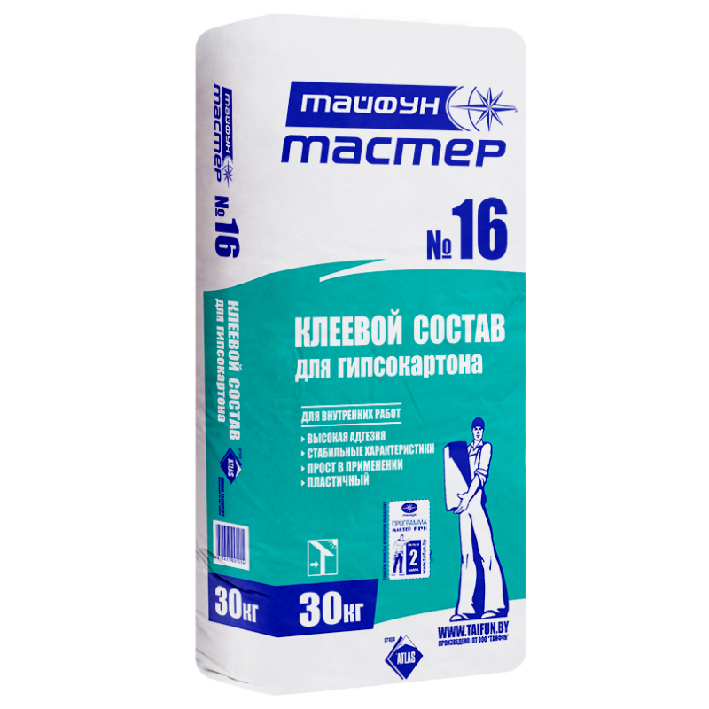 ТАЙФУН МАСТЕР №16Клеевой состав «Тайфун Мастер» №16 используется для крепления гипсокартонных (ГКП) и гипсоволокнистых (ГВЛ) плит, а также для заполнения швов в стыках ГКП и ГВЛ. Применяется для работы внутри помещений.Подготовка поверхности: Поверхность должна быть ровной, очищенной от пыли, грязи, жировых, масляных пятен, краски и других веществ и образований, препятству-ющих адгезии клеевого состава.Способ приготовления: В предварительно подготовленную емкость налить холодную чистую воду и засыпать клеевой состав «Тайфун Мастер» №16 в ориентировочной пропорции: 30 кг клеевого состава на 17,5 – 18,0 литра воды. Добавление каких-либо добавок (цемент, гипс, ПВА) в состав не допускается. Вымешивать состав до однородной массы следует мешалкой корзиночного типа (миксер). Состав готов к работе и сохраняет свои свойства в течение 20 минут.Нанесение состава:Состав наносится на чистую поверхность ГКЛ (ГВЛ) при помощи шпателя в виде конусов с шагом не более 300 мм по вертикали и горизонтали.При этом высота конуса должна быть в два раза больше расстояния от поверхности стены до внутренней поверхности листа. Затем лист ГКЛ(ГВЛ) прикладывают к стене, выставляя его по шнуру и уровню. После установки листа клеевым составом при помощи шпателя из нержавеющей стали заполняют пространство между стеной и листом со стороны укладки последующей плиты.Упаковка: Мешки по 30кгТехнические характеристики:Оптимальная рабочая температура основания и окружающей среды от +5ºС до +25ºСРасход на 1мм толщины слоя прим. 1,5 кг/м2/мм (2,9 - 4,3 кг на м2)Толщина слоя5 - 35 ммВремя использования готового состава, не более 20 минДальнейшее производство работ через 5 часовСрок хранения: 6 месяцев от даты изготовления.