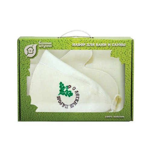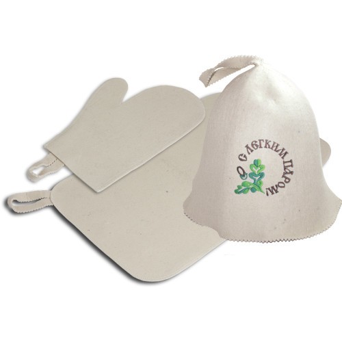 Набор из 3-х предметов (шапка, С лёгким паром, рукавица, коврик) - предназначен для использования в бане или сауне, упакован в коробку и будет отличным подарком. Коврик убережет от ожогов в сауне, шапочка предотвратит тепловой удар и не позволит высокой температуре и влажности испортить волосы, а рукавица не позволит вам обжечься паром.Материал - войлок.
