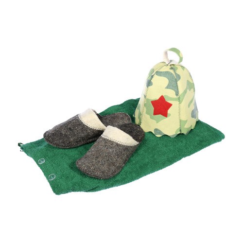 Описание: В подарочных банных наборах есть всё необходимое для создания незабываемой атмосферы и отличного настроения в парной! Сделайте приятный сувенир Вашим близким - подарите им один из этих замечательных наборов, и может быть, любителей бани станет еще больше.Предназначение: Для использования в бане, сауне и дома.Срок годности: Не ограничен.Комплектность: Накидка дбани и сауны муж., шапка Армейская, тапочки войлок.