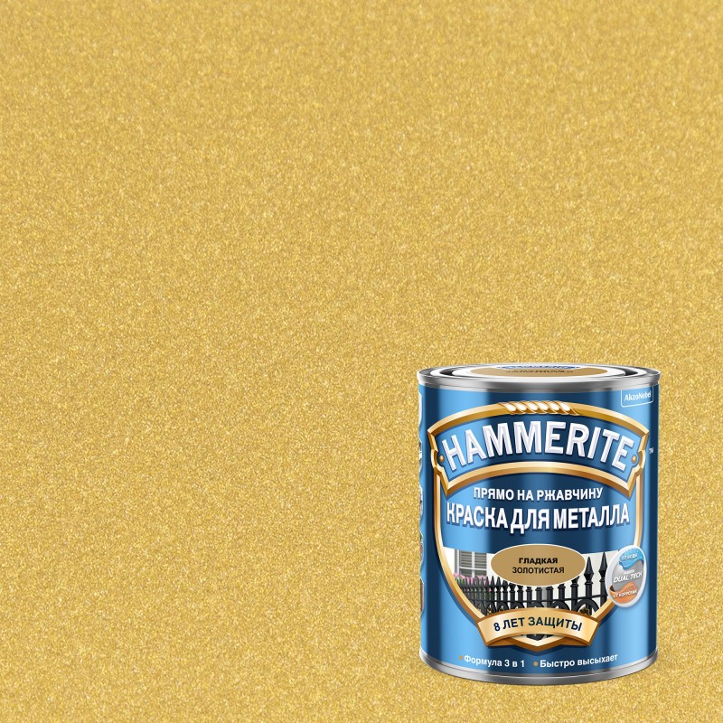 Краска для металла HAMMERITE гладкая 0,75л золотистая защищает поверхность до 8 лет, образует атмосферостойкое эластичное, нерастрескивающееся покрытие с грязе- и водоотталкивающими свойствами, устойчиво к воздействию бытовых химикатов и кратковременному воздействию моторного топлива и маселОБЛАСТЬ ПРИМЕНЕНИЯ: внутренние и наружные работыТЕМПЕРАТУРА НАНЕСЕНИЯ: +5 С° до +30 С°ВРЕМЯ ВЫСЫХАНИЯ: 4 часаПОВТОРНОЕ НАНЕСЕНИЕ: через 4 - 6 часовСПОСОБ НАНЕСЕНИЯ: валик; кисть; краскопультРАСХОД: 1 л на 10 м² в 1 слойТЕРМОСТОЙКОСТЬ ПОКРЫТИЯ: от -20 С° до +80 С°РАЗБАВЛЕНИЕ: Растворителем и Очистителем Hammerite, при работе кистью – не требуется, при работе валиком – для первого слоя разбавить не более 1:10 ( 1 часть растворителя к 10 частям краски Хаммерайт);ОСОБЕННОСТИ ПРИМЕНЕНИЯ: для поверхностей черного металла, цветного металла, дерева, твердых видов пластика• на ржавые металлические поверхности необходимо отшлифовать поверхность, используя грубую наждачную бумагу;• на металлические поверхности без покрытия необходимо обезжирить поверхность Очистителем и растворителем Hammerite;• на ранее окрашенные металлические поверхности отшлифуйте окрашенную поверхность с целью удаления неплотно держащегося покрытие, блеска старого покрытия, очищения от загрязнений. Тщательно промойте поверхность раствором чистящего средства, смойте раствор чистой водой. Дождитесь высыхания поверхности. Проверьте совместимость с исходной краской. При наличии несовместимости она будет очевидна в течение часа после нанесения;• на блестящие и гладкие металлические поверхности необходимо дополнительное шлифование, обезжирьте поверхность очистителем и растворителем Hammerite. При необходимости улучшить сцепление краски с поверхностью можно при помощи грунта Spesial Metals Primer.• на неокрашенные гальванизированные/алюминиевые поверхности цветных металлов необходимо воспользоваться для максимальной адгезии грунтом для алюминия, цветных металлов и сплавов Hammerite Spesial Metals Primer.• на пластмассу необходимо использовать грунт Hammerite Spesial Metals Primer для улучшениия адгезии между слоями. Hammerite можно окрашивать некоторые виды пластмассы используемые для изготовления канализационных и водосточных труб. Краску Hammerite нельзя использовать на поверхностях, находящихся в длительном контакте с водой, например на внутренней стороне труб.• на дерево используйте Hammerite Spesial Metals Primer для улучшения адгезии между слоями если это новая древесина; при окрашивании ранее окрашенной древесины необходимо отшлифовать поверхность, удалить блеск и загрязнения, тщательно промыть поверхность раствором чистящего средства, смыть чистой водой, дождаться высыхания поверхности