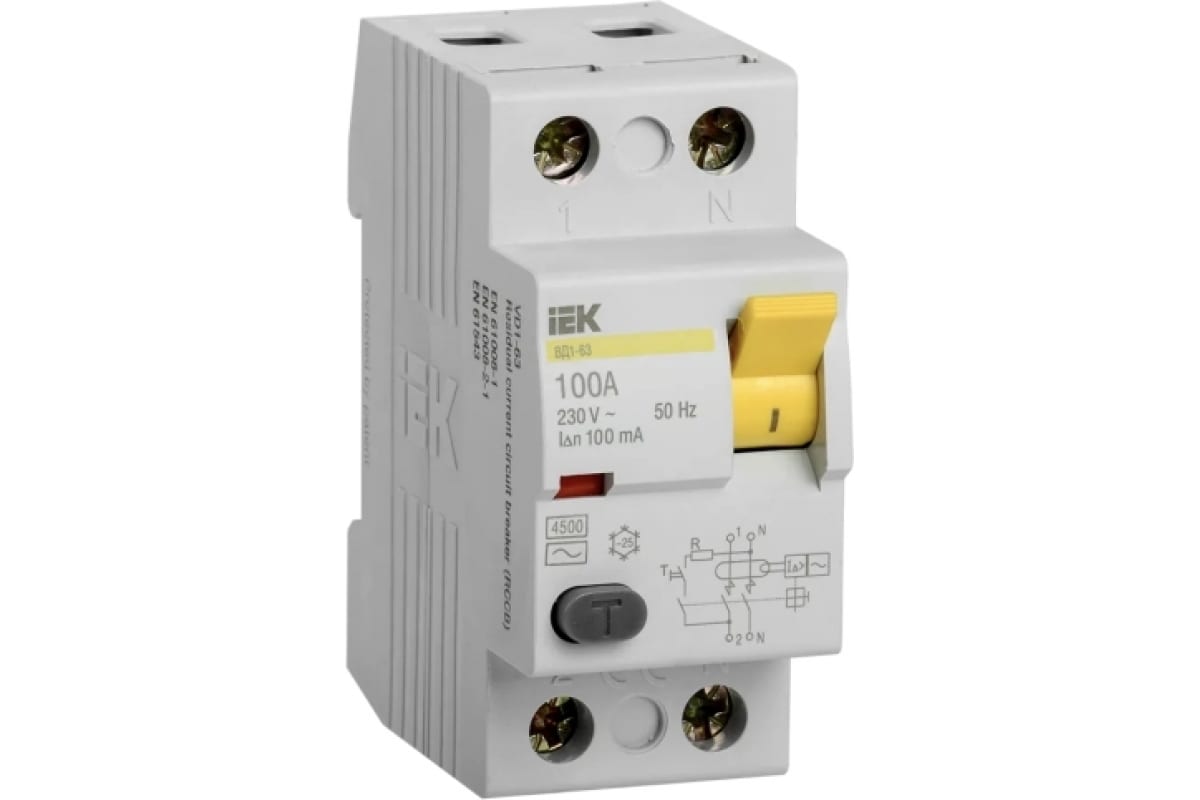 Дифференциальный выключатель IEK УЗО ВД1-63 2Р100А 100мА ИЭК MDV10-2-100-100