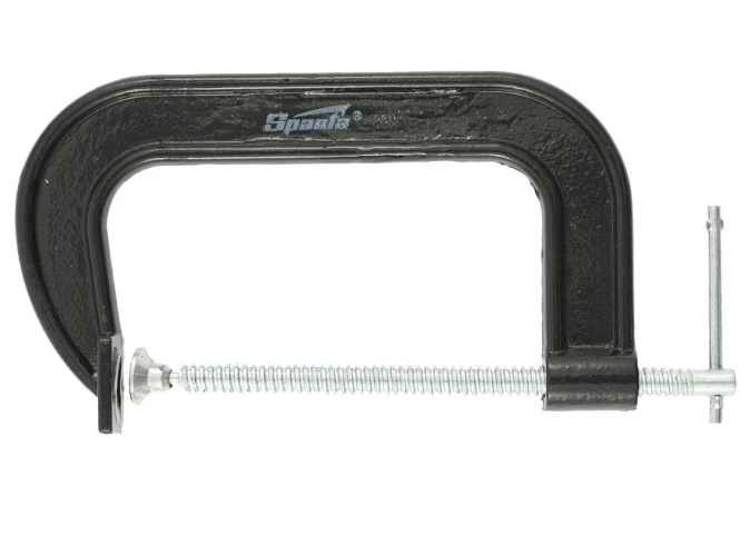 Рама струбцины покрыта цветным лаком. Винт струбцины со специальным зажимом и крупной червячной резьбой позволяет надежно фиксировать предметы