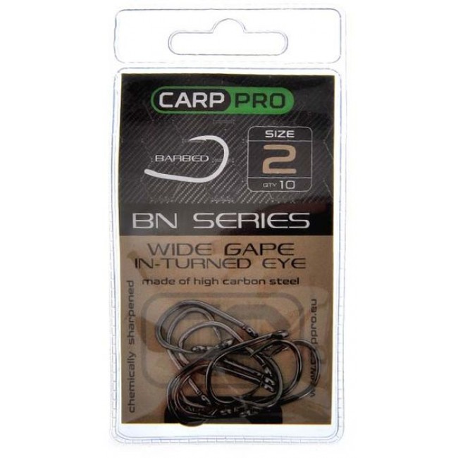 Carp Pro Black Nickel Wide Gape in-turned Eye — серия крючков с широким зевом и правильно подогнутым внутрь ушком. Такая универсальная форма придает этой серии мегазасекаемость и отличную фиксацию рыбы.