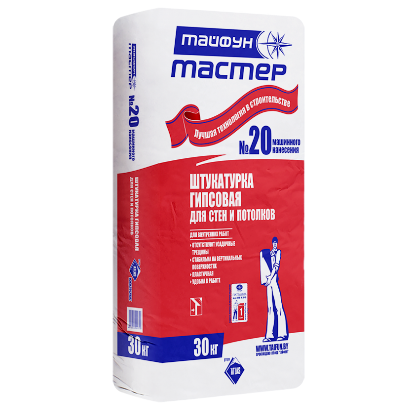 ТАЙФУН МАСТЕР №20 МАШ.НАНЕСЕНИЯШтукатурный состав «Тайфун Мастер» №20 М.Н. применяется для выравнивания поверхностей потолков, стен и перегородок из различных материалов внутри помещений с нормальным температурно-влажностным режимом эксплуатации. Применение состава «Тайфун Мастер» №20 позволяет отказаться от шпатлевания поверхностей перед нанесением декоративных покрытий (обоев, декоративных штукатурок).Подготовка поверхности:Поверхность должна быть очищенной от пыли, грязи, жировых, масляных пятен, краски и других веществ и образований, препятствующих адгезии штукатурного состава. Основание необходимо укрепить грунтовкой «Тайфун Мастер» №100 («Тайфун Мастер» №102), “INTER GRUNT «Тайфун Мастер» №101.Способ приготовления:В предварительно подготовленную емкость налить холодную чистую воду и засыпать штукатурный состав «Тайфун Мастер» №20 в пропорции: 30 кг штукатурного состава на 18,5 – 19,5 литра воды. Применение каких-либо добавок не допускается. Вымешивать состав до однородной массы мешалкой корзиночного типа (миксер). Приготовленную смесь выдержать 5 минут и повторно перемешать. Полученный состав сохраняет свои свойства в течение 1 часа.Нанесение:Состав наносится на подготовленное основание ручным или механизированным способом с последующим выравниванием правилом. Мелкие дефекты корректируются после начала схватывания (поверхность смачивается водой, затирается и заглаживается).Расход:Ориентировочный расход сухой смеси на 1 мм толщины слоя составляет 1,0-1,2 кг/м2. Фактический расход зависит от характера поверхности и опыта рабочего.Инструмент:Пластмассовая емкость, электродрель с мешалкой корзиночного типа (миксер), резак штукатурный, кельма штукатурная, шпатель, правило, терка, штукатурная станция для «Тайфун Мастер» №20м.н.Требования безопасности:- к работам по приготовлению и применению состава не следует допускать лиц, имеющих заболевания кожных покровов, глаз и дыхательных путей.- в процессе работы обязательно применять средства индивидуальной защиты органов дыхания, кожных покровов и глаз.Состав:Смесь гипса, полимерного связующего, наполнителя и добавок.МАССА НЕТТО: 30 кгОптимальная рабочая температура основания и окружающей среды от +5ºС до +25ºСРасход на 1мм толщины слоя прим. 1,0-1,2 кг/м2Толщина слоя (ручное нанесение) 5-20 ммТолщина слоя (машинное нанесение) 5-30 ммВремя использования готового состава, не более 60 минКоэффициент паропроницаемости покрытия не менее 0,03 мг/м▪ч▪ПаУсадка покрытия в слое проектной толщины отсутствие трещинСрок хранения: 6 месяцев от даты изготовления