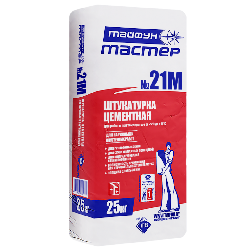 ТАЙФУН МАСТЕР №21, №21МШтукатурный состав «Тайфун Мастер» №21 (21М) применяется для выравнивания вертикальных, горизонтальных и наклонных поверхностей при выполнении наружных и внутренних отделочных работ.Подготовка поверхности:Поверхность должна быть очищенной от пыли, грязи, жировых, масляных пятен, краски и других веществ и образований, препятствующих адгезии штукатурного состава. Основание необходимо укрепить грунтовкой «Тайфун Мастер» №100 («Тайфун Мастер» №102) или “INTER GRUNT” «Тайфун Мастер» №101.Способ приготовления:В предварительно подготовленную емкость налить холодную чистую воду и засыпать штукатурный состав «Тайфун Мастер» №21 в пропорции: 25 кг штукатурного состава на 5,0 – 5,5 литра воды. Вымешивать состав следует до однородной массы мешалкой корзиночного типа (миксер). Через 5 минут повторно перемешать. Время использования готового состава «Тайфун Мастер» №21 – в течение 120 минут, «Тайфун Мастер» №21М – в течение 30 минут.Нанесение:Состав равномерно наносится набрасыванием или намазыванием с последующим выравниванием правилом, теркой. Толщина одного слоя от 5 до 20 мм. Последующие слои наносятся после полного высыхания предыдущего. При толщине штукатурного слоя свыше 20 мм его необходимо армировать сеткой. Высыхающее штукатурное покрытие должно предохраняться от повреждений, намокания, замерзания, пересушивания, нагрева свыше 25°С и интенсивного сквозного проветривания в течение первых двух суток.Расход:Ориентировочный расход сухой смеси на 1 мм толщины слоя составляет 1,6-1,8 кг/м2. Фактический расход зависит от характера поверхности и опыта рабочего.Требования безопасности:- к работам по приготовлению и применению состава не следует допускать лиц, имеющих заболевания кожных покровов, глаз и дыхательных путей.- в процессе работы обязательно применять средства индивидуальной защиты органов дыхания, кожных покровов и глаз.Состав:Смесь цемента, полимерного связующего, наполнителя и добавок.МАССА НЕТТО: 25 кгОптимальная рабочая температура основания и окружающей среды №21 от +5ºС до +25ºСОптимальная рабочая температура основания и окружающей среды №21м от -5ºС до +10ºСРасход на 1мм толщины слоя прим. 1,6-1,8 кг/м2Время использования готового состава №21/ №21м, не более 120 мин /30 минКоэффициент паропроницаемости покрытия не менее 0,02 мг/м▪ч▪ПаСрок хранения: 12 месяцев от даты изготовления