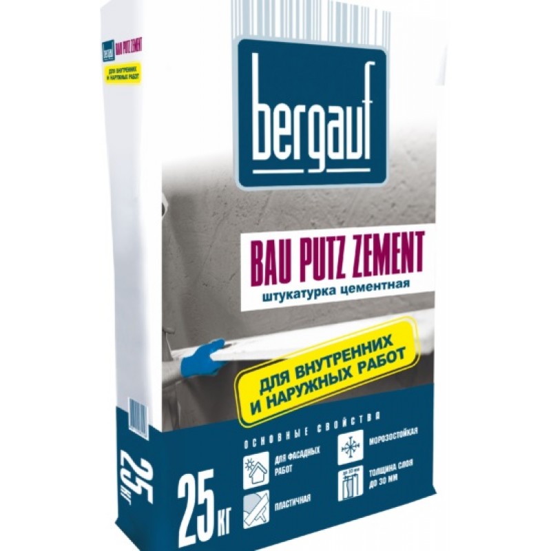 Бергауф Bau Putz Zement – штукатурка водостойкая, морозоустойчивая, на цементной основе. Рекомендована к использованию для фасадной отделки. Подходит для кирпичных, бетонных, железобетонных, ячеистобетонных поверхностей. Применяется как основа для облицовки плиткой, под окрашивание, оклейку обоями, декоративное оштукатуривание. Наносится вручную, и с применением специализированной техники.УСЛОВИЯ ДЛЯ ПРОВЕДЕНИЯ РАБОТ:Основание следует предварительно очистить от различных отслоений, масла, запылений и прочих мешающих адгезии элементов. Обработанную поверхность желательно покрыть грунтовкой Bergauf, узнать подробнее и приобрести которую Вы также можете в нашей компании.Для получения безопасного и качественного результата необходимо четко соблюдать пропорции и прочие инструкции по правильному изготовлению и использованию раствора.В процессе работ необходимо поддерживать температуру воздуха в интервале +5°С…+25°С. Оптимальный расход воды при разведении смеси: 0,20 – 0,22 л (1 кг смеси); 5,0 – 5,5 л (25 кг смеси). Полученную массу необходимо довести до однородного состава.Органы дыхания и зрения крайне необходимо защитить от контакта с раствором.ТЕХНИЧЕСКИЕ ХАРАКТЕРИСТИКИ:Цвет: серыйВяжущее: цементМаксимальная фракция: до 0,63 ммРасход сухой смеси на 1 м2: ~16-18 кгТолщина наенесения минимальная: 5 ммТолщина наенесения максимальная: 30 ммМаксимальная толщина нанесения при частичном выравнивании: 50 ммЖизнеспособность готового раствора в открытой таре: 3 часаВремя полного набора прочности: 28 сутокЗатирка после нанесения допускается через: 5 часовПроведение работ при температуре основания: от +5 °С до +30 °СМарочная прочность: М 60Прочность на сжатие (через 28 суток): 6 МПаПрочность на изгиб (через 28 суток): 2 МПаПрочность сцепления с основанием (через 28 суток): 0,5 МПаТемпература эксплуатации: от -50 °C до +70 °СМорозостойкость: F 50