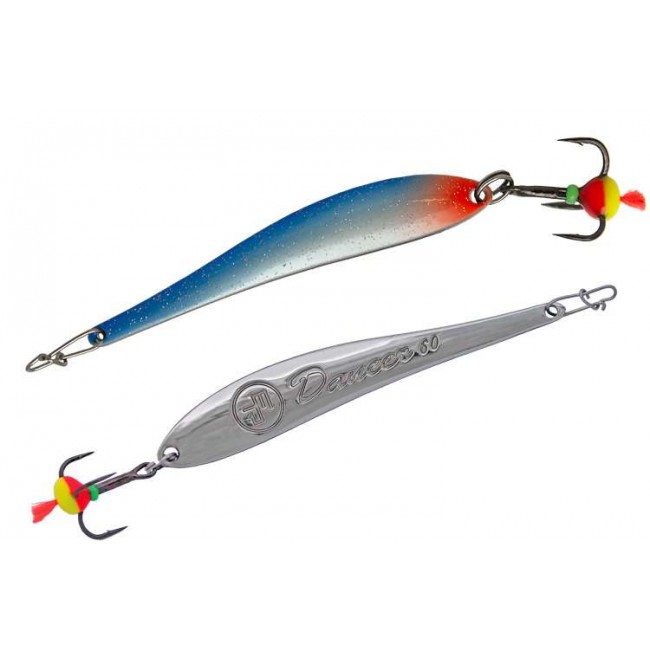 Название Dancer («Танцор») говорит само за себя. Игра блесны в своем роде уникальна, при сбросе «осыпается» довольно с широкой амплитудой, зигзагообразно, как бы танцуя, практически без отклонения от вертикали. Форма зимней вертикальной блесны Dancer веретенообразная, ассиметричная, выгнутая по своей оси вдоль тела и немного по поперечному сечению. В действительно Dancer напоминает маленькую уклеечку. Колебания блесны не интенсивные, довольно плавные. При тестовых испытаниях модели, блесна отлично отработала по судаку, окуню и щуке.артикул - EPVJDRT70BLS