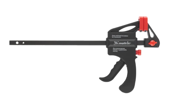 Струбцина изготовлена из ударопрочной пластмассы. Направляющая стальная. Рабочие губки снабжены накладками для предотвращения повреждений обрабатываемых предметов. Опорная губка перемещается и фиксируется по всей длине направляющей при помощи ручки, а также может переставляться на другой конец направляющей, что позволяет использовать струбцину «на разжим».
