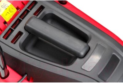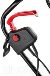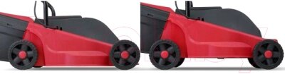• В комплекте корпус, рукоятка, колеса, травосборник, крюк крепления кабеля, ручка травосборника, рычаг включения, коробка управления, крышка отсека выброса травы, зажимы-фиксаторы, кнопка блокировки включения