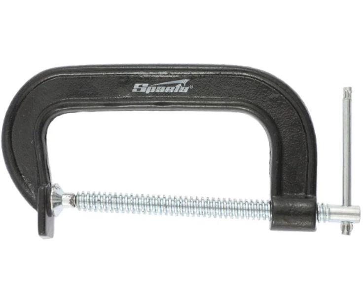 Рама струбцины покрыта цветным лаком. Винт струбцины со специальным зажимом и крупной червячной резьбой позволяет надежно фиксировать предметы