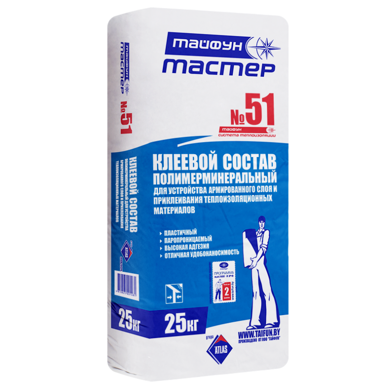 Клеевой состав «Тайфун Мастер» № 51/ «Тайфун Мастер» № 51М предназначен для устройства армированного слоя по пенополистирольным и минераловатным плитам в легкой штукатурной системе утепления зданий и сооружений методом «Тайфун». Также может быть использован для приклеивания теплоизоляционных материалов к утепляемой поверхности.