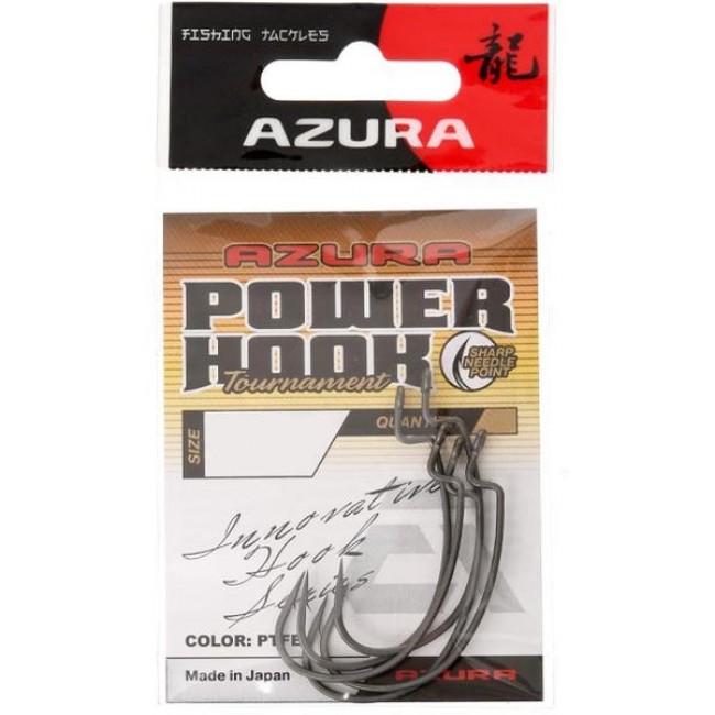 Azura Tournament Power Hook – серия офсетных крючков с PTFE покрытием. Оно обеспечивает минимальное трение крючка о приманку и идеальное проникновение в ткани пасти хищника. Кроме того, это покрытие защищает крючки от коррозии, что особенно актуально, когда на них насажены съедобные приманки, имеющие в своем составе соль. Крючок Azura Tournament Power Hook имеет широкий поддев, жало расположено выше той прямой, на которой лежит колечко и начало цевья крючка. Это обеспечивает хорошую зацепистость и легкий выход крючка из тела мягкой приманки. Крючки серии Tournament Power Hook сочетаются с мягкими приманками разных видов среднего и большого размеров.артикул - ATPH50