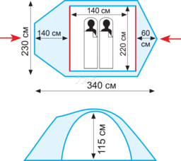 Модель имеет 2 входа и 1 спальное отделение, вход в которое защищен противомоскитной сеткой. Для полноценной вентиляции предусмотрены 2 больших окна.