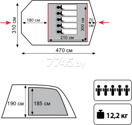Палатка TRAMP Baltic Wave 5 (V2) – просторная кемпинговая палатка, рассчитанная на размещение 5 человек. Предназначена для отдыха большой компанией в теплое время года: летом, весной и осенью.Палатка имеет 2 входа, 2 тамбура: один высокий, второй - более компактный, которые можно использовать для хранения вещей. Входы в спальное отделение и в тамбур продублированы москитной сеткой, для эффективного проветривания в палатке предусмотрены 2 больших вентиляционных окна. Для установки козырька используются 2 стальных колышка.Двухслойный тент выполнен из полиэстера, водостойкость внешнего слоя составляет 5000 PU, дно изготовлено из терпаулинга (армированного полиэтилена) водостойкостью 10000 PU. Дуги каркаса изготовлены из дюрапола (армированного проволокой фибергласса), они обладают высокой прочностью и устойчивостью.Швы палатки проклеены, к нижней кромке тента по всему периметру пришита специальная ветрозащитная юбка для обеспечения большего комфорта и безопасности в сложных погодных условиях.В комплект поставки входят стальные колышки, штормовые оттяжки, ремкомплект.