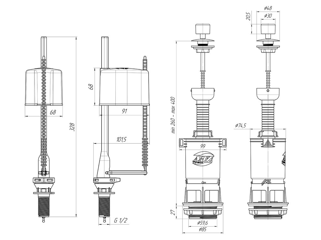 Набор для бачка унитаза. Наливной механизм с нижней подводкой и пластиковой резьбой диаметром 1/2. Сливной механизм ручка со штоковым режимом слива эконом