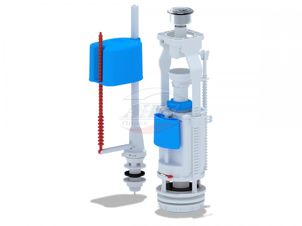 Набор для бачка унитаза. Наливной механизм с нижней подводкой и пластиковой резьбой диаметром 1/2. Сливной механизм металлизированная кнопка с двойным режимом слива эконом
