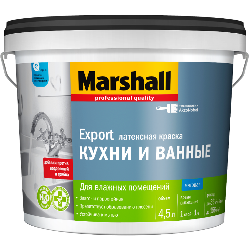 Краска MARSHALL Export Кухни и ванные - матовая латексная краска повышенной влагостойкости для стен и потолков*Выдерживает воздействие пара и образование конденсата*Препятствует возникновению плесени*Устойчива к частому мытью с применением мягких моющих средств*Без брызг и потековОПИСАНИЕМатовая водно-дисперсионная (латексная) краска для внутренних работ в помещениях с повышенной влажностью, а также в помещениях с высокой эксплуатационной нагрузкой. Образует покрытие с высокими декоративными свойствами, устойчивое к воздействию пара от бытовых приборов (чайника, пароварки) и образованию конденсата. Входящие в состав краски специальные добавки предотвращают возникновение плесени и водорослей. Окрашенная поверхность выдерживает мытье с применением мягких моющих средств. Краска легко наносится и быстро высыхает.ОБЛАСТЬ ПРИМЕНЕНИЯДля внутренних работ. Пригодна для нанесения на полностью просохшие минеральные поверхности (бетон, штукатурка, кирпич и т. п.), гипсокартон, обои под покраску, ДВП. Рекомендуется для окрашивания помещений с повышенной влажностью, таких как кухни, ванные, душевые, прачечные, помещения для сушки белья и пр. Сертифицирована в РФ для применения в детских и лечебно-профилактических учреждениях.ОСОБЕННОСТИ ПРИМЕНЕНИЯПеред применением разбавить в рекомендованной пропорции водой и тщательно перемешать. Произвести подготовку поверхности грунтовкой Marshall Export Bаse. Рекомендуется наносить в два слоя при температуре от +5°C до +30°С, относительной влажности воздуха <80%.ТЕХНИЧЕСКИЕ ДАННЫЕУникальные компоненты: добавки против водорослей и грибкаСвязующее: стирол-акриловая дисперсияРазбавитель: водаРабочие инструменты: кисть, валик, распылительСухой остаток (масс): 43,4%Плотность: 1,24 кг/лВремя до нанесения финишного покрытия: 1 чаcВремя полного высыхания покрытия: 2-4 часаРасход (в 1 слой): до 8 м2/лБазы: BW, BCСистема колеровки: AcomixСрок и условия хранения: 2 года при t° от +5°С до +30°С вдали от источников излучения, нагревательныхи осветительных приборовУход за окрашенной поверхностью: высокоустойчива к мытью с применением мягких моющих средств, не оставляйте поверхность мокрой после очистки.Степень блеска при угле отражения 60°: матовая